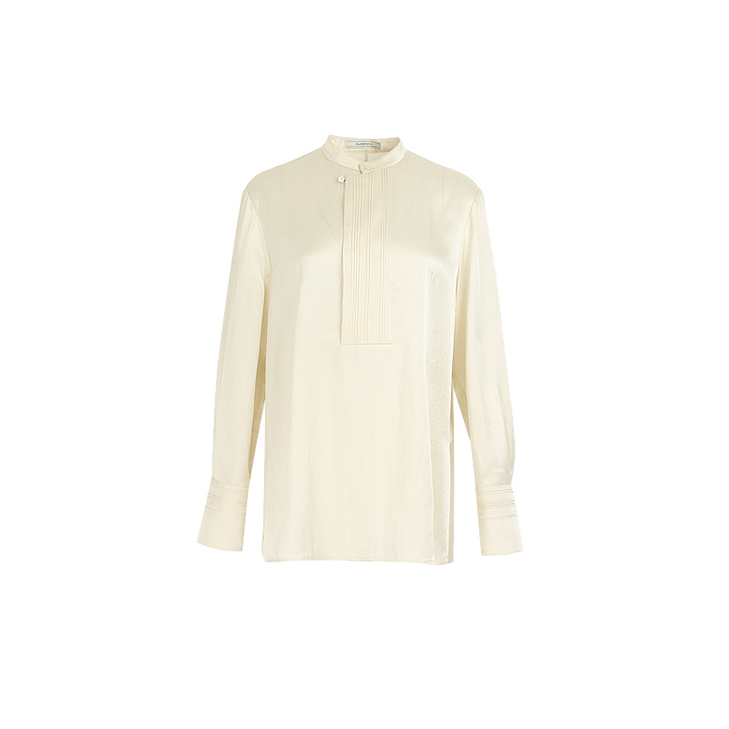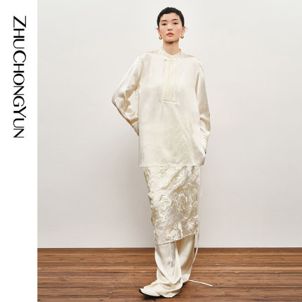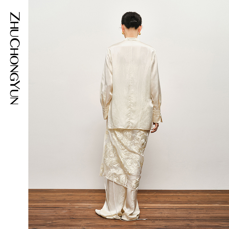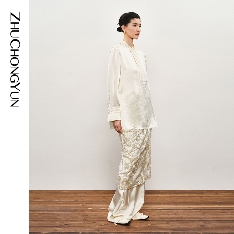ZHUCHONGYUN2025秋新款米黄色立领褶裥织条光泽缎面直身衬衫上衣