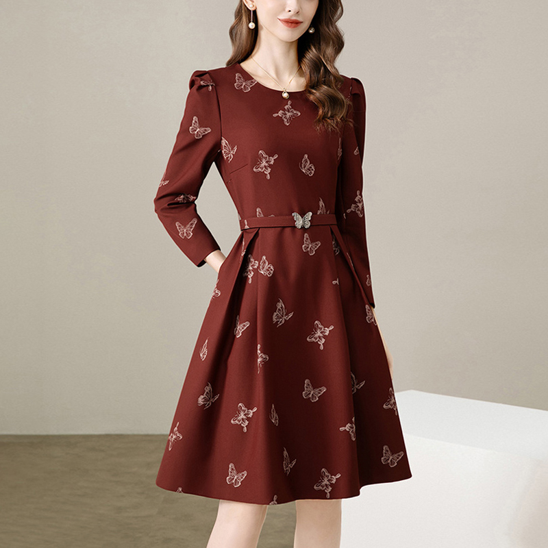 时尚优雅气质红色系带连衣裙女秋装2025新款收腰显瘦长袖印花裙子