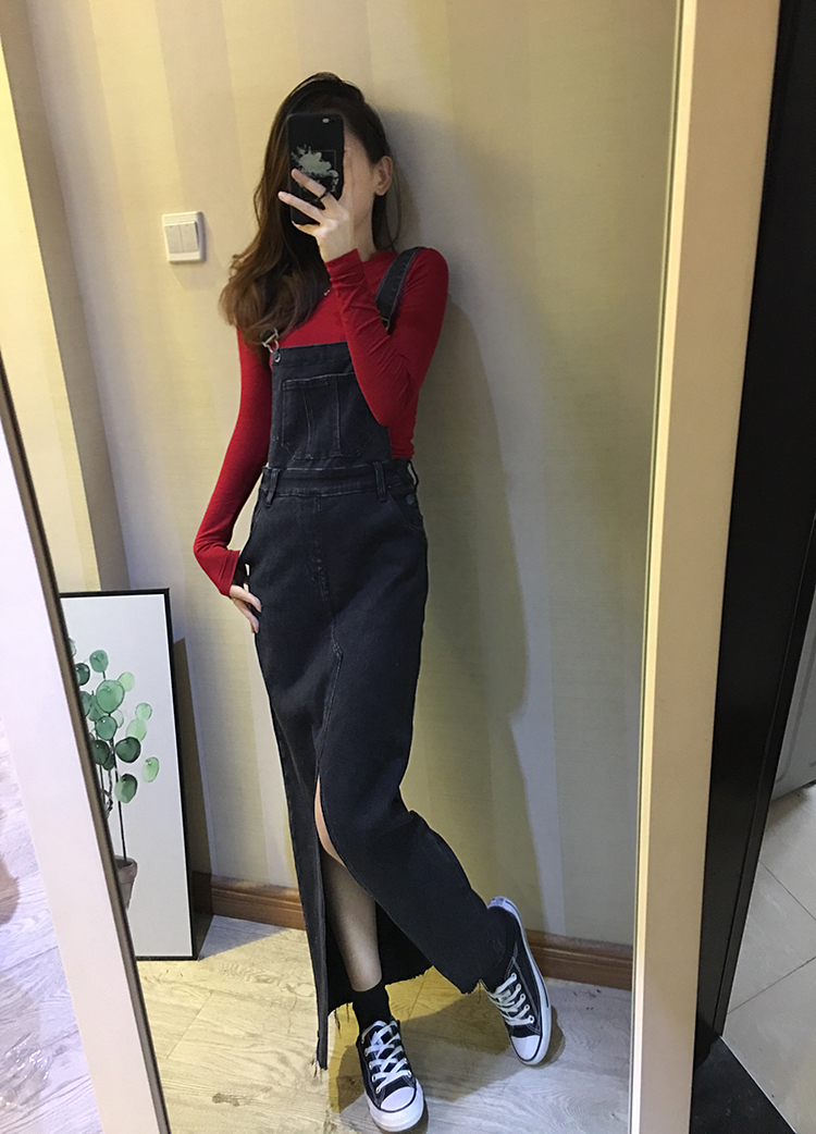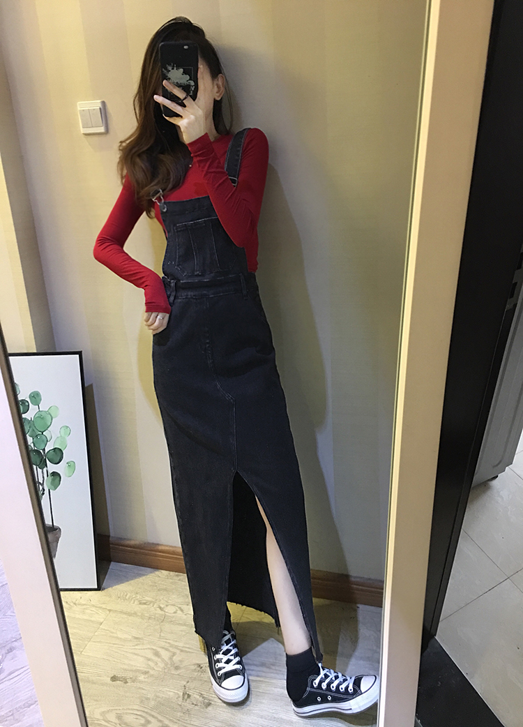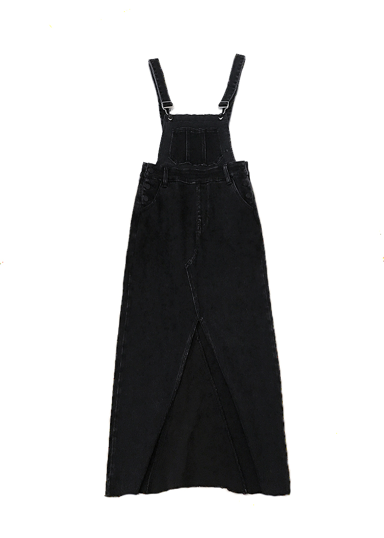 欧洲站2025春秋新款欧货休闲修身毛边开叉长裙牛仔背带裙半身裙潮