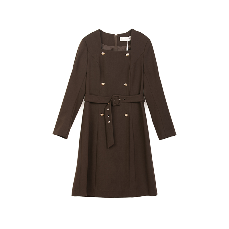 诗梦女装秋季新款复古咖色连衣裙方领收腰中长款系带显瘦裙子