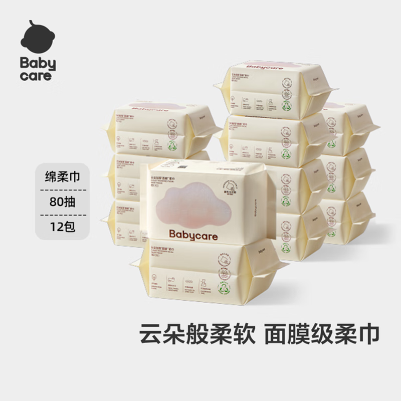 Babycare云朵面膜级柔巾80抽12包加厚婴儿湿巾干湿两用柔软洗脸巾