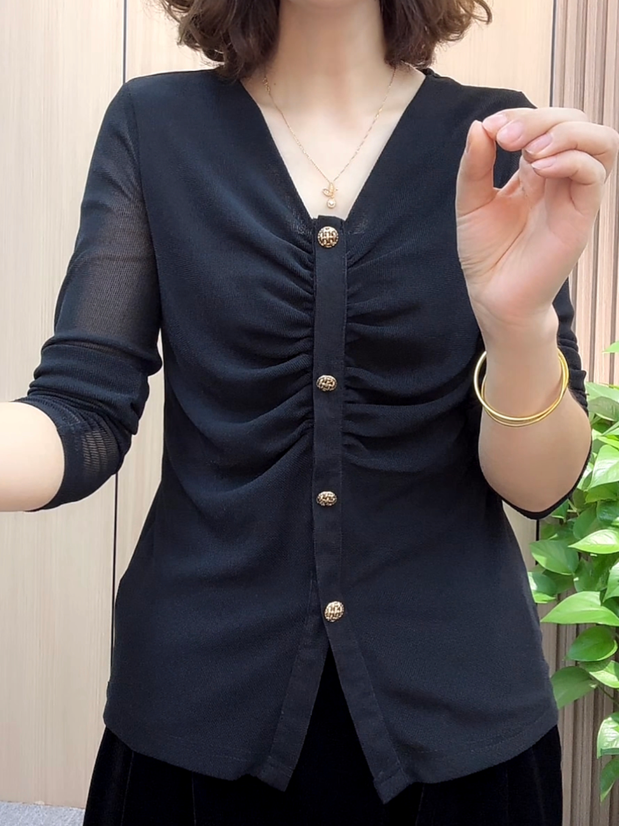 春秋新款妈妈装V领网纱纯色时尚洋气显瘦气质百搭长袖打底小衫女