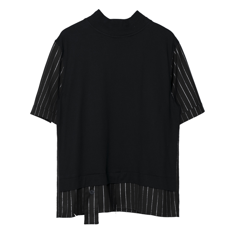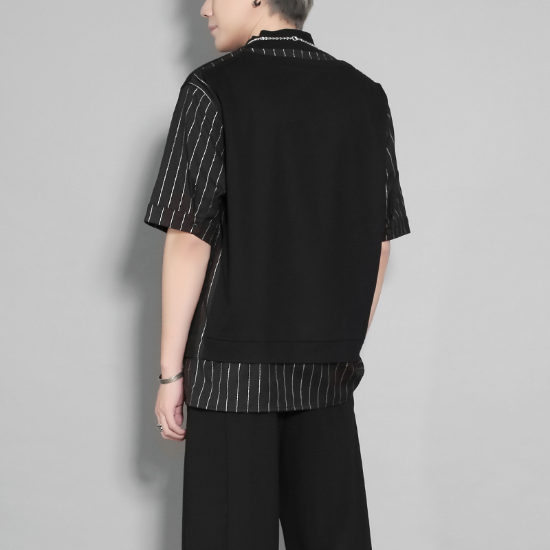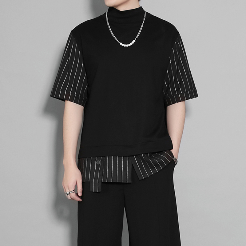 原创暗黑系港风条纹撞色拼接假两件衬衫男士休闲半高领t恤男夏装