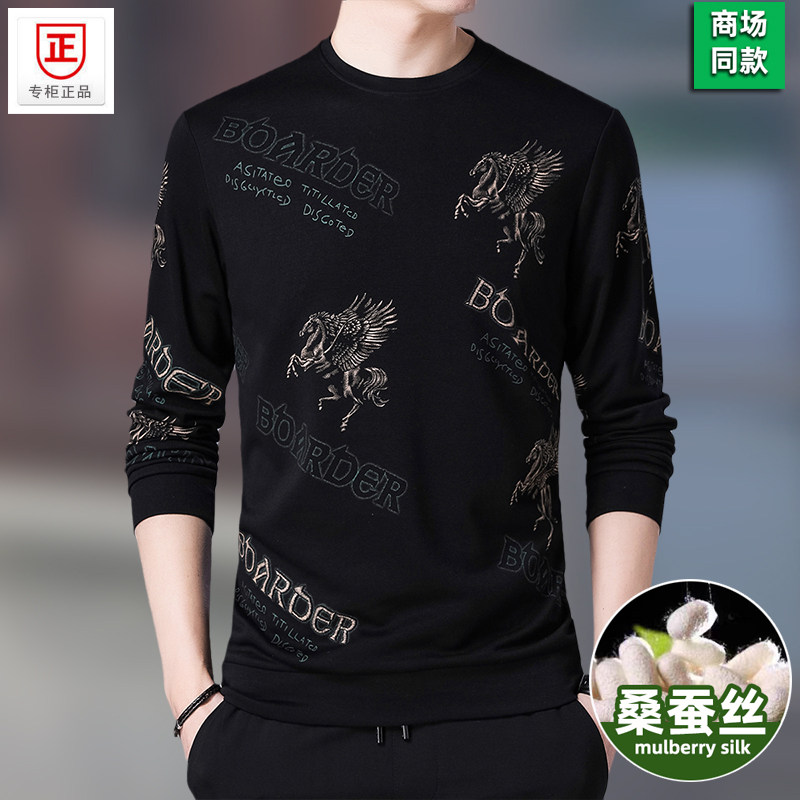 皮尔卡丹桑蚕丝长袖t恤男士圆领印花时尚卫衣男春秋款打底衫上衣