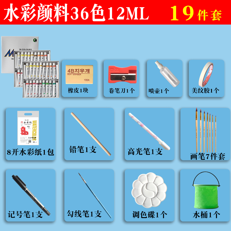 马利牌水彩颜料入门工具套装无毒幼儿园儿童小孩小学生用初学者手绘美术生专用专业色彩绘画12色24色管装盒装