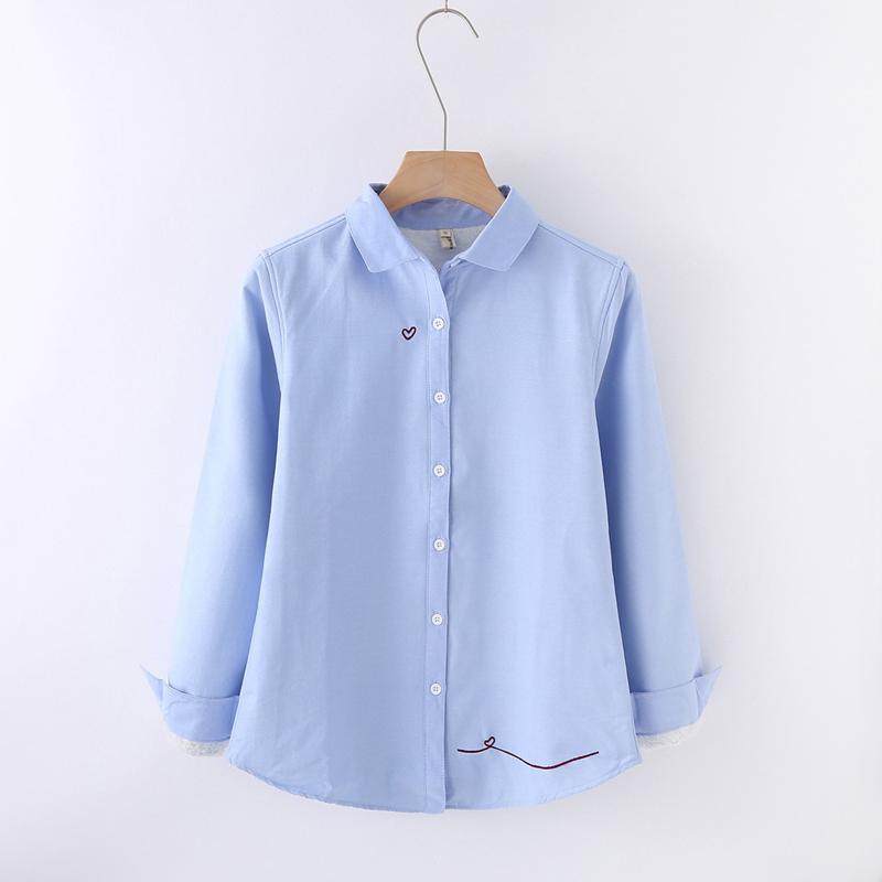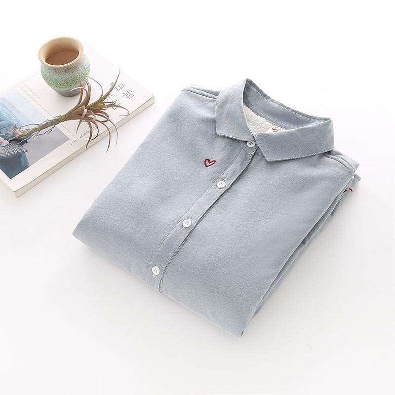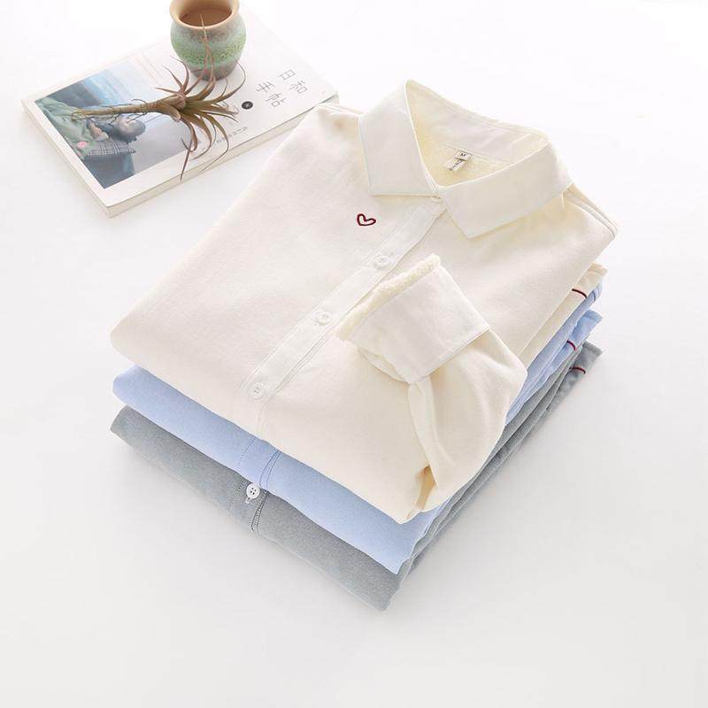 冬季新款小清新刺绣加绒白衬衫女长袖加厚一体绒保暖衬衣内搭打底
