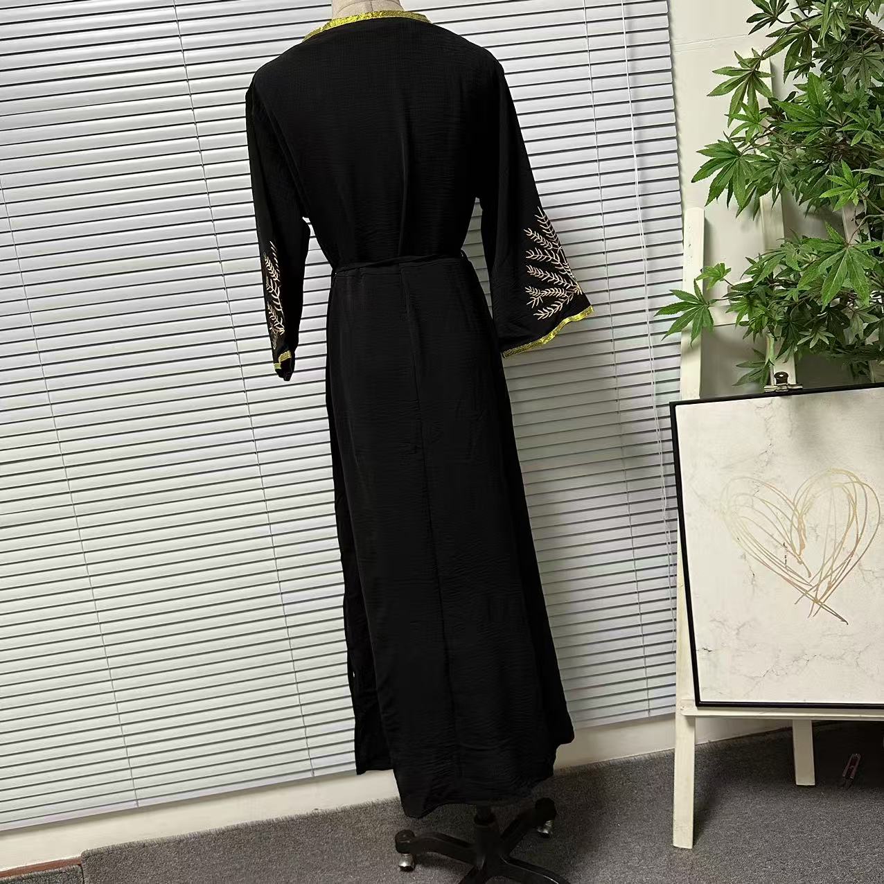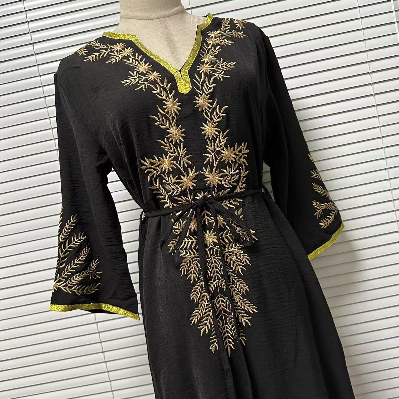 0819-4波西米亚民族风宽松大码V领七分袖刺绣花开叉长裙连衣裙