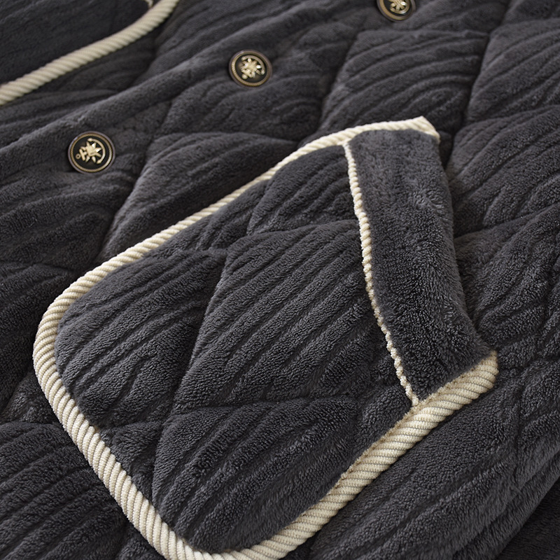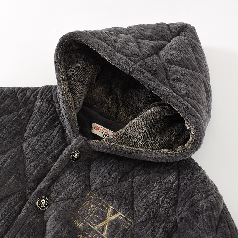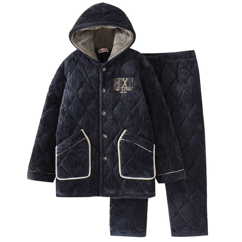 加肥加大码睡衣男士冬季三层加厚珊瑚绒保暖夹棉连帽法兰绒家居服