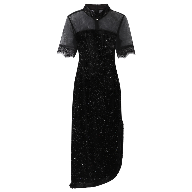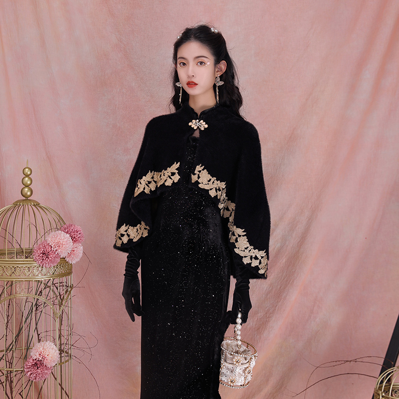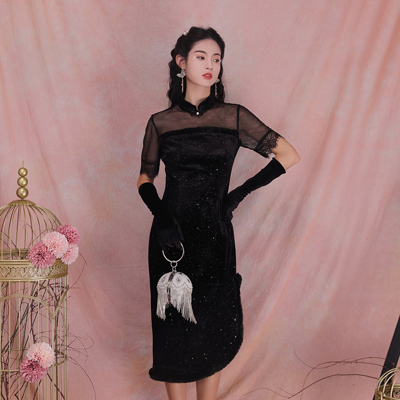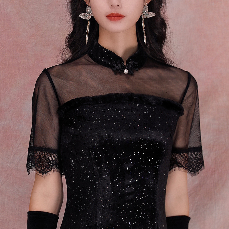 槿爷烨明2024年新款黑色修身显瘦高端气质旗袍秋冬名媛宴会礼服裙