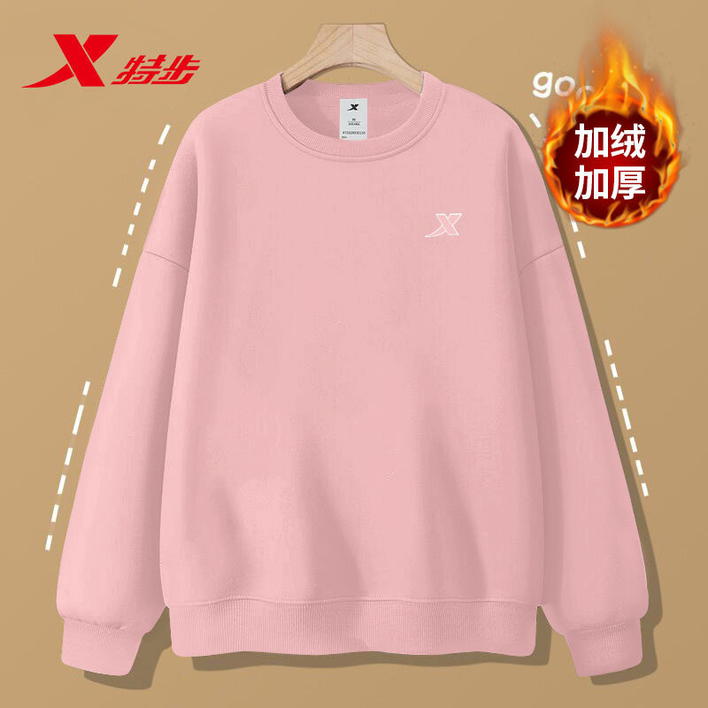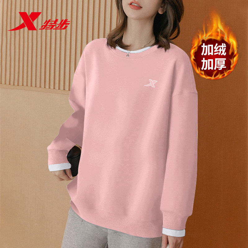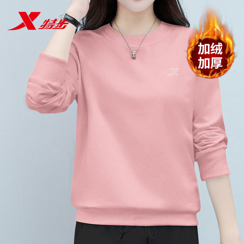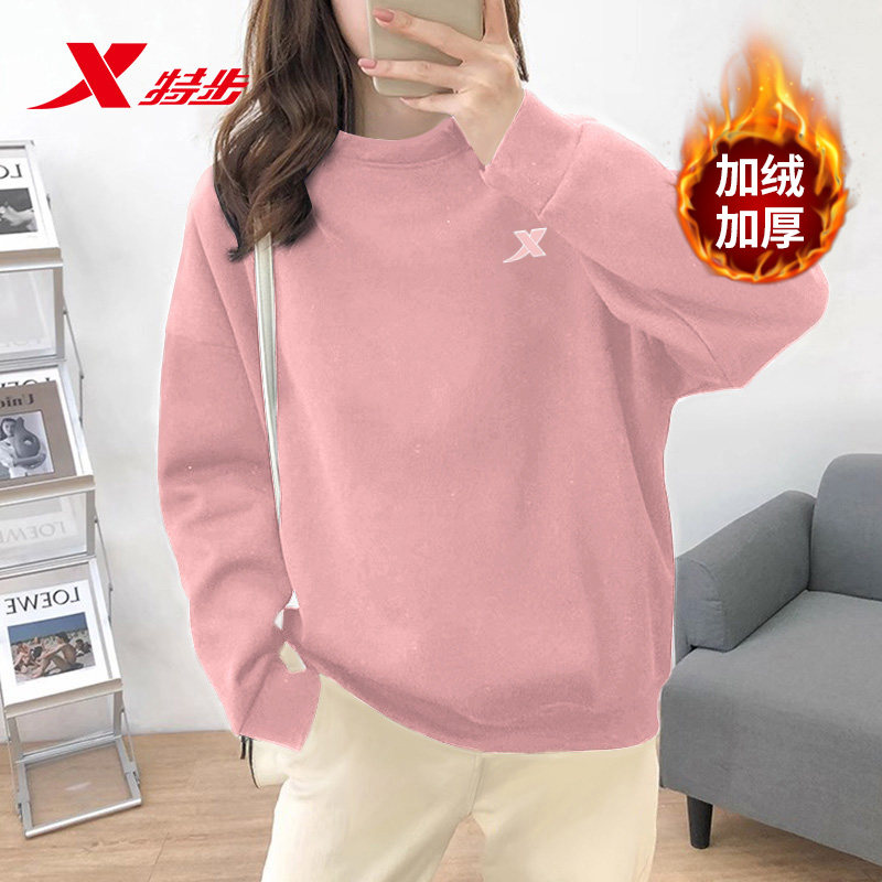 特步加绒卫衣女秋冬季宽松运动服长袖加厚休闲上衣保暖圆领跑步衣