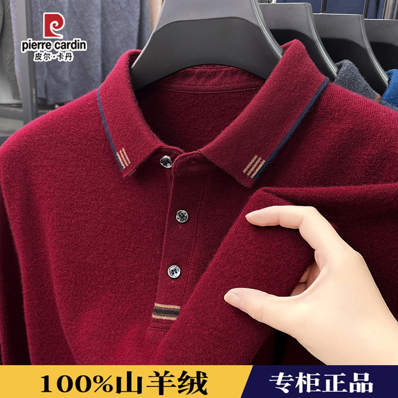 皮尔卡丹高端秋冬厚款羊绒衫男100纯羊绒中年爸爸装翻领长袖T恤衫