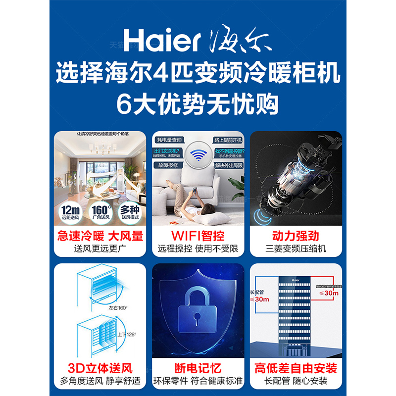 【新款】海尔4匹商用柜机220V立式家用空调中央空调变频100LW官方