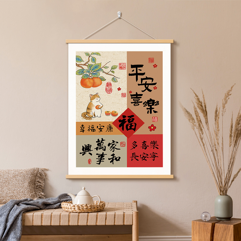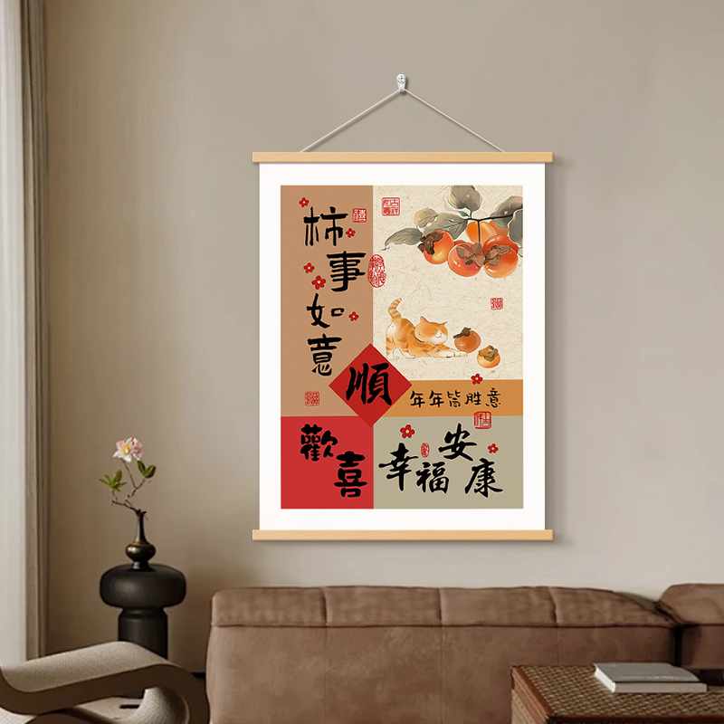 平安喜乐书法字画办公室挂画柿事如意客厅装饰画福顺欢喜玄关挂轴