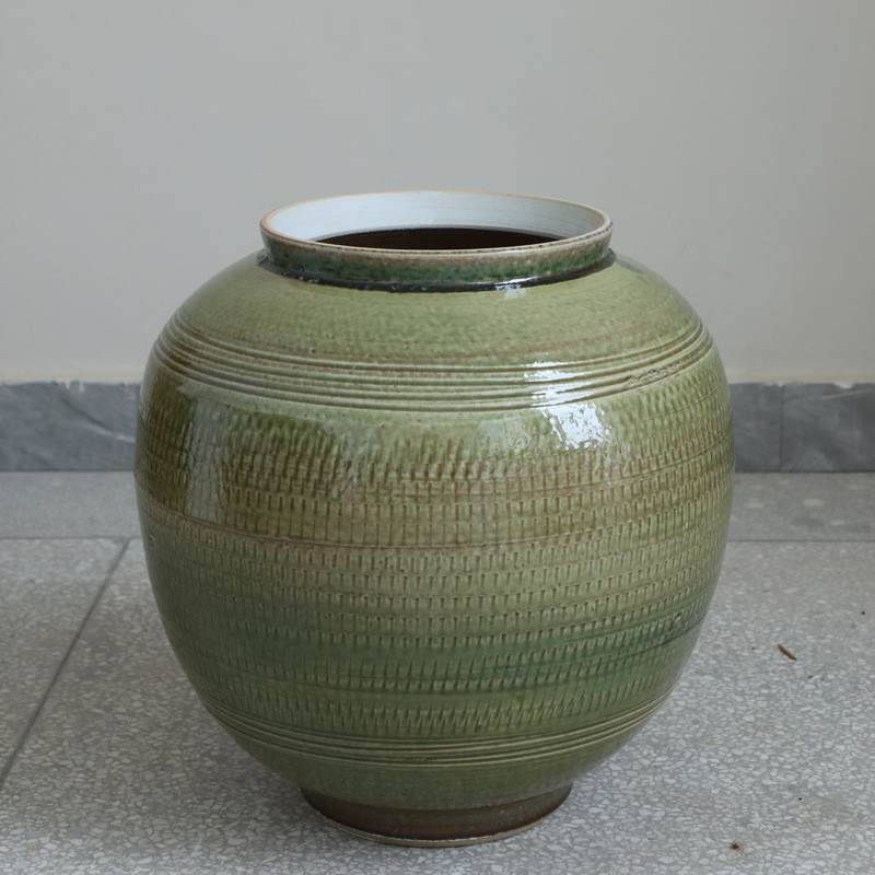 景观园林装饰插花摆件简约绿色大型月亮罐陶瓷落地花瓶民宿罐油画