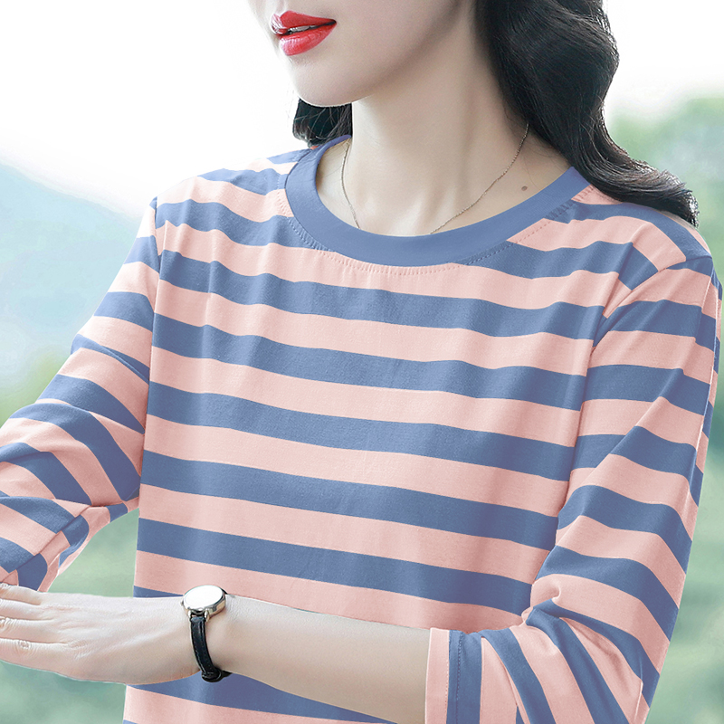 2025年新款纯棉条纹长袖t恤女打底衫秋装百搭外穿宽松大码妈妈装