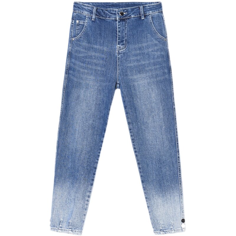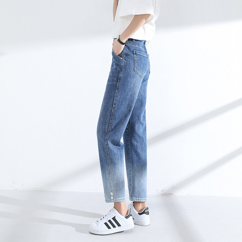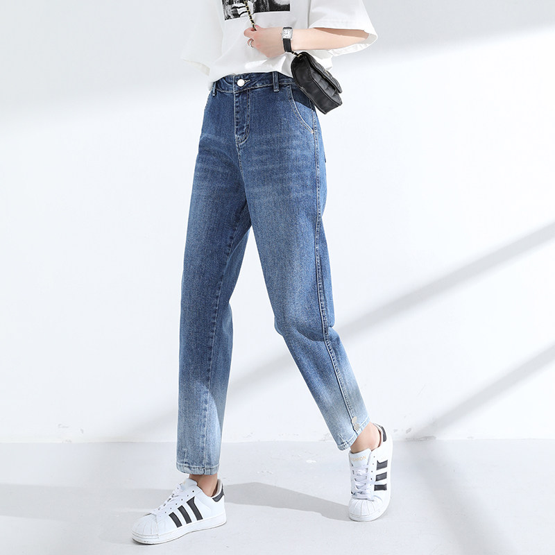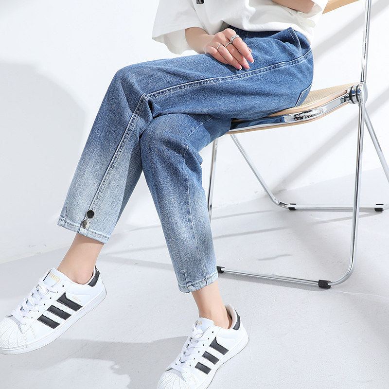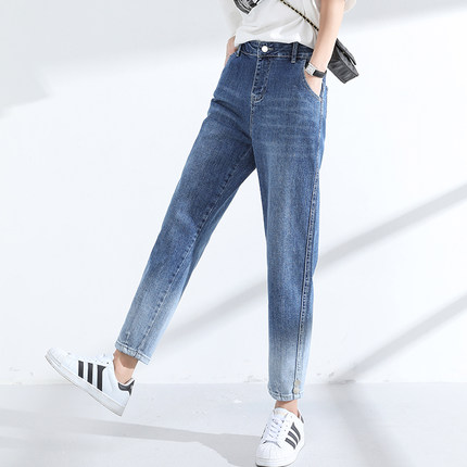 胖mm牛仔裤女高腰宽松老爹哈伦裤大码女裤渐变奶奶九分裤浅色裤子