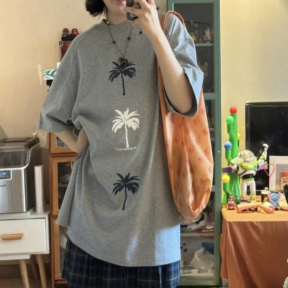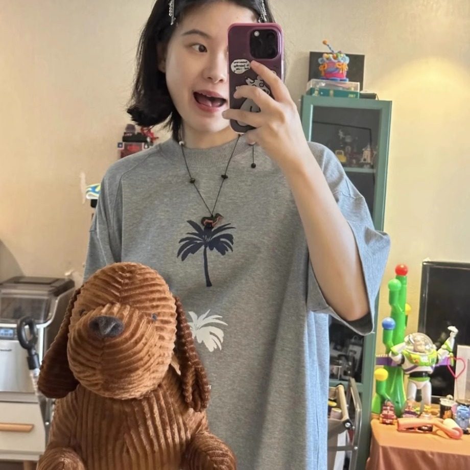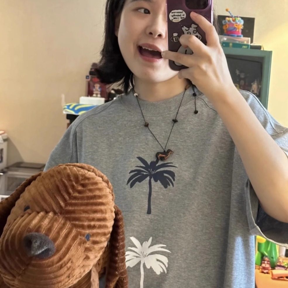 纯棉灰色正肩短袖t恤女2025新款夏季宽松美式半袖设计感小众上衣