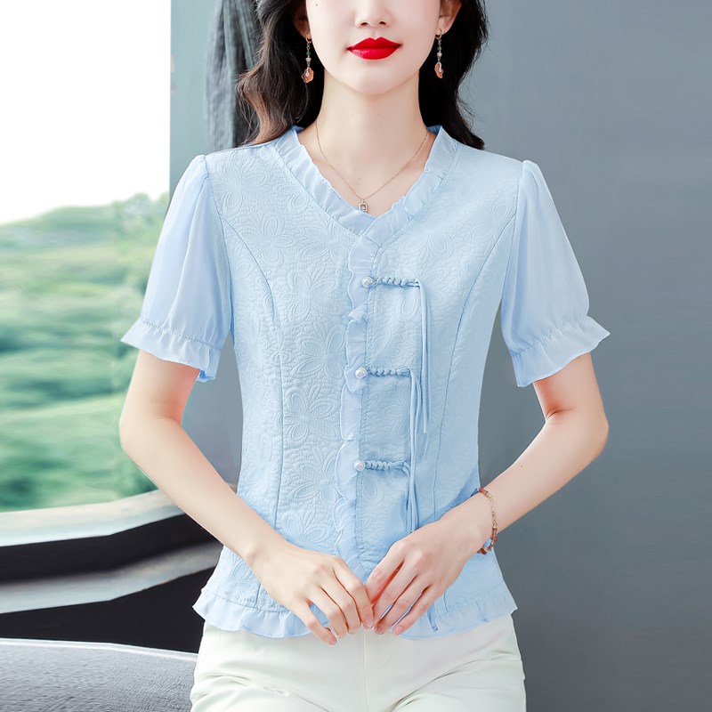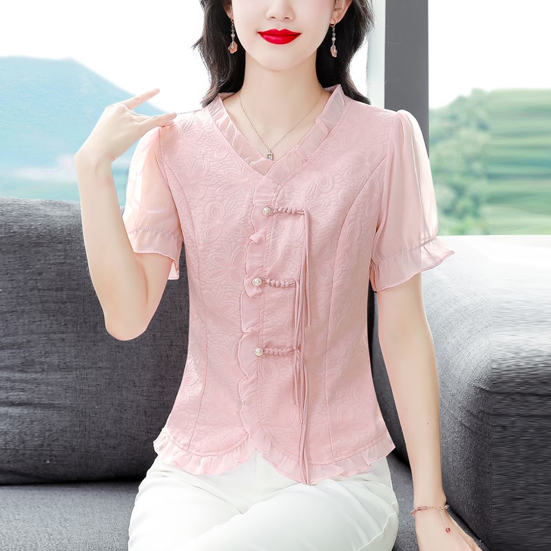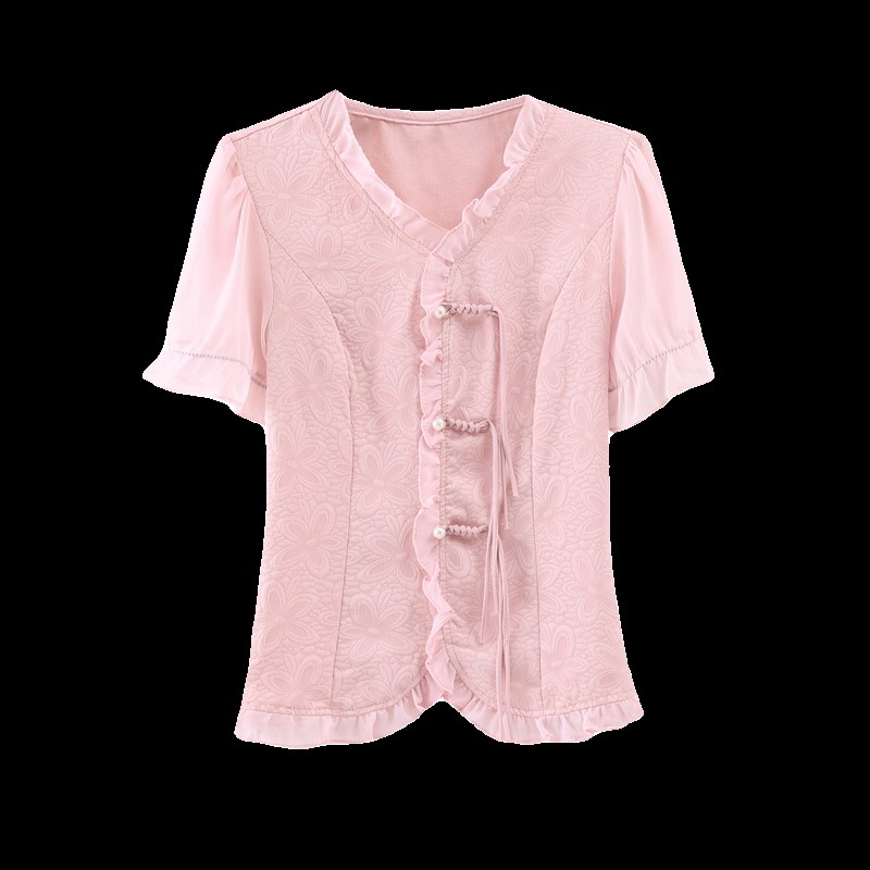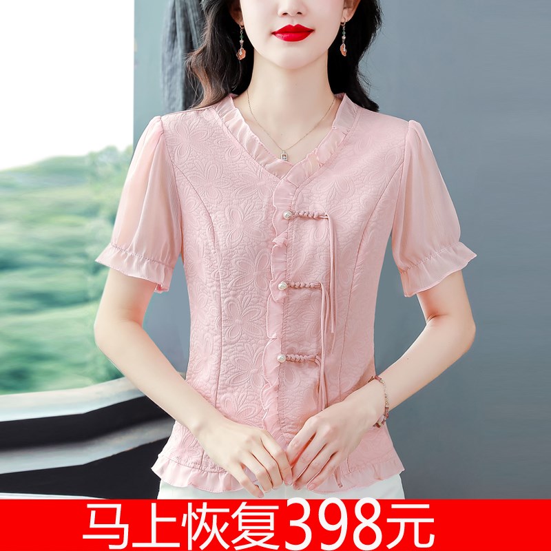 短袖提花雪纺衬衫女夏季新款新中式国风小个子短款上衣气质小衫