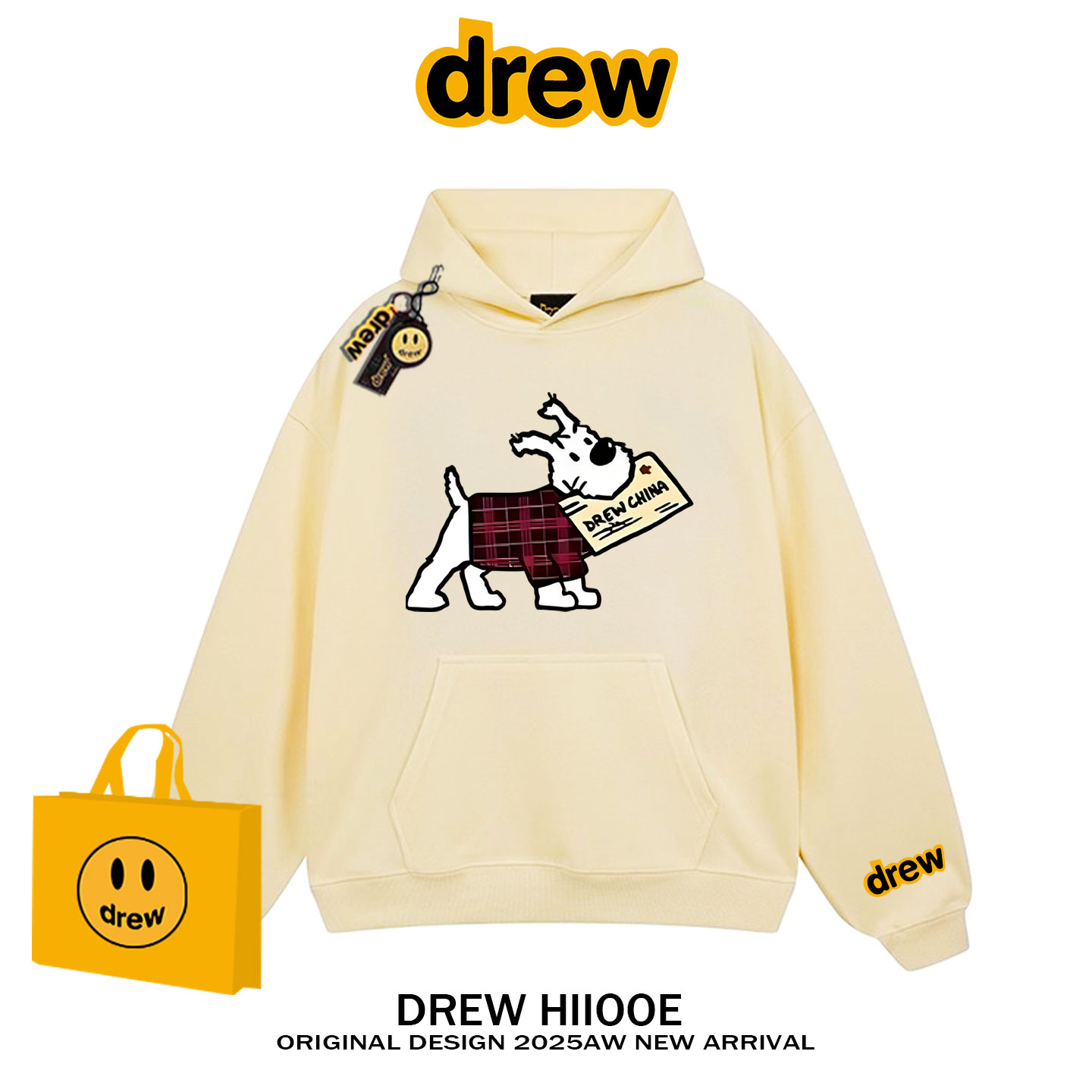 drew美式潮牌格子小狗印花连帽卫衣男女秋冬复古宽松情侣纯棉外套
