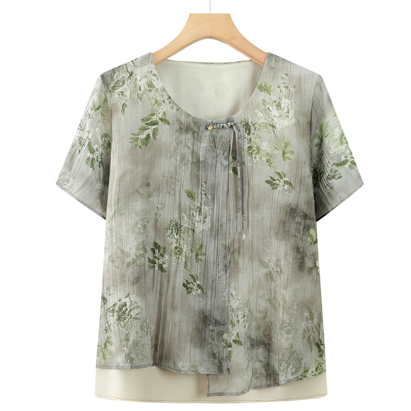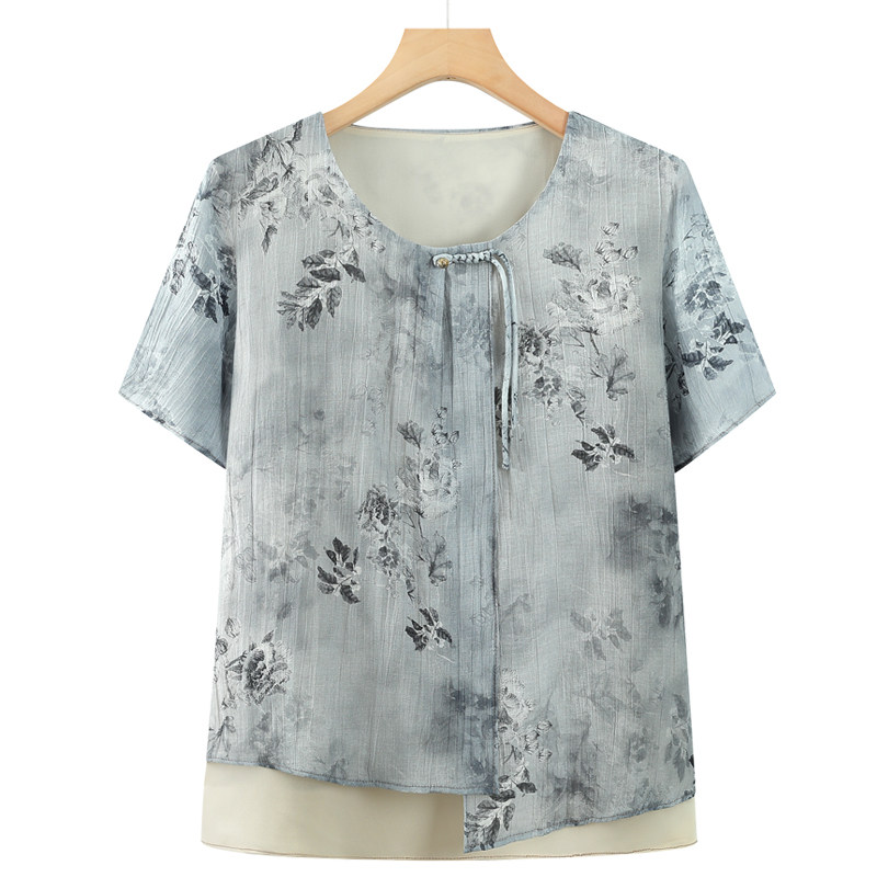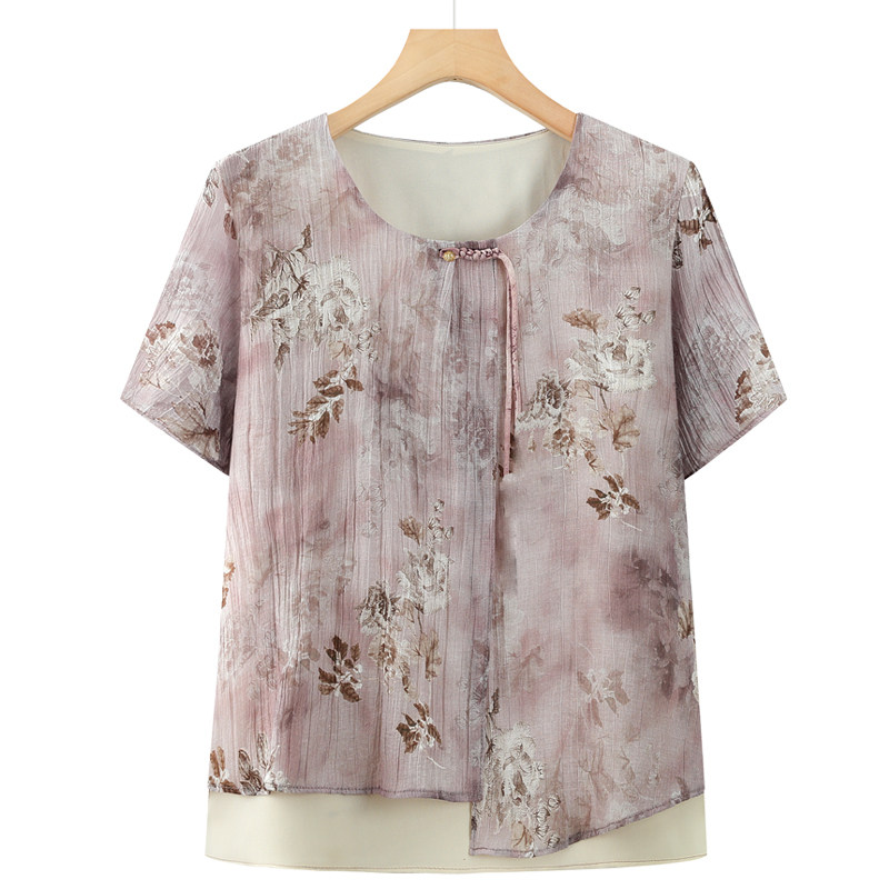 奶奶装夏装短袖T恤女中老年人夏季新款假两件雪纺上衣老太太衣服
