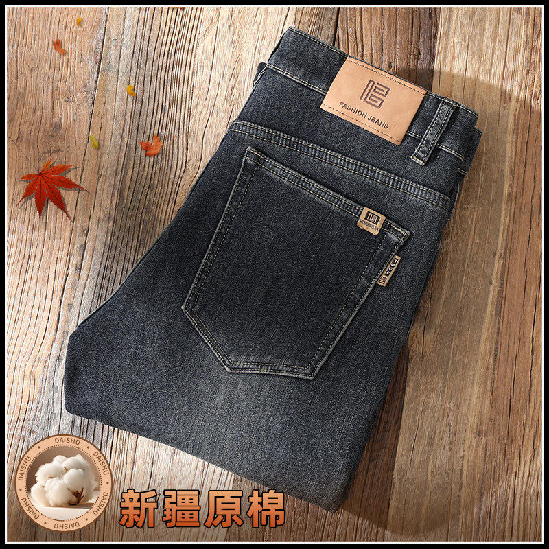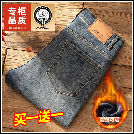Yishion以纯官方时尚正品复古水洗牛仔裤男冬季加绒修身弹力长裤