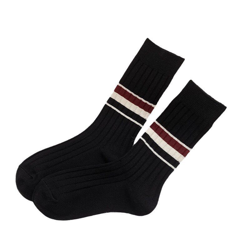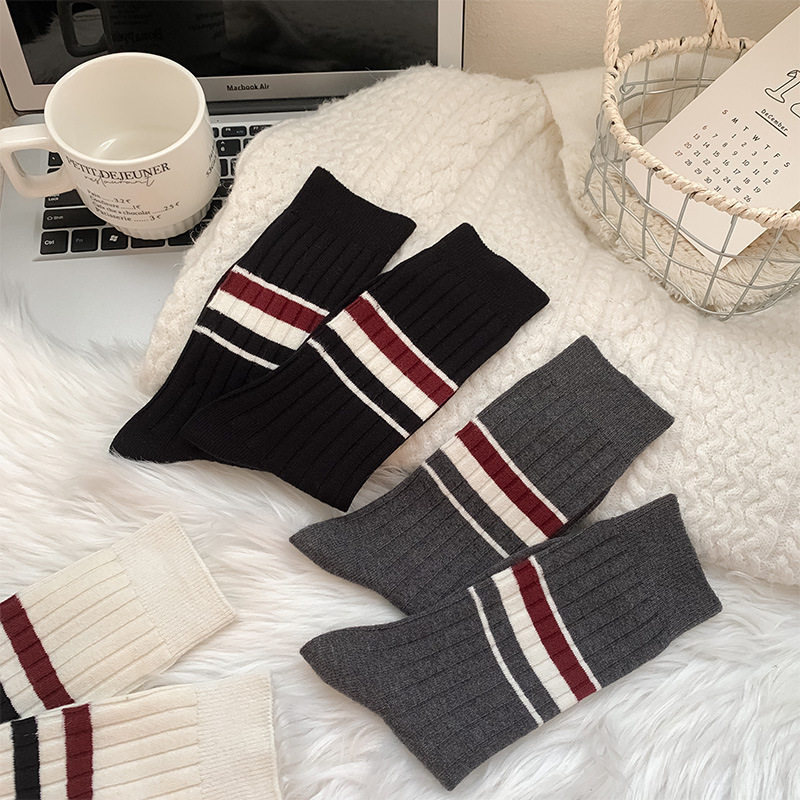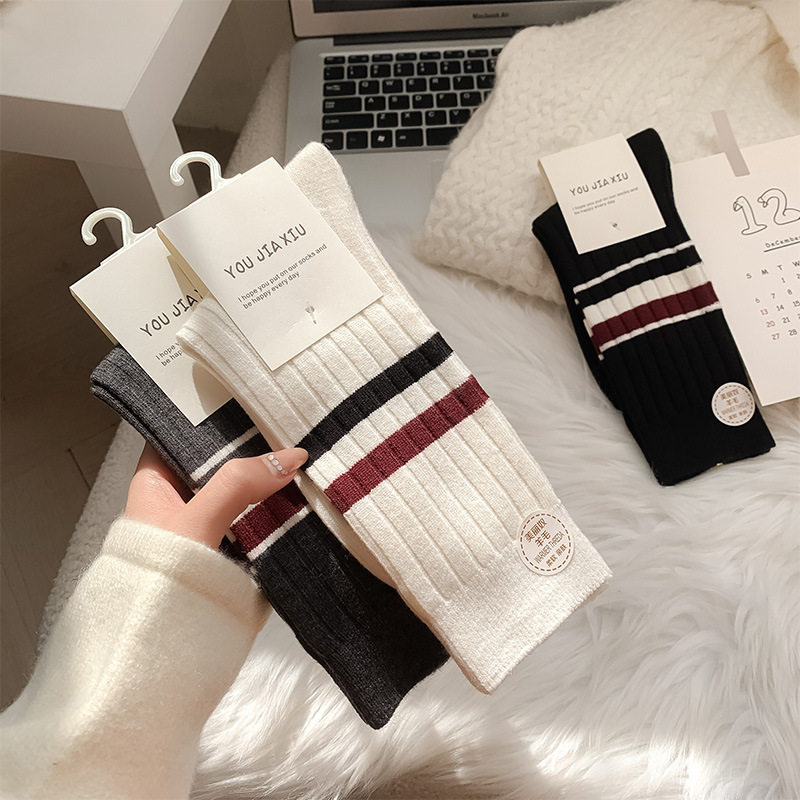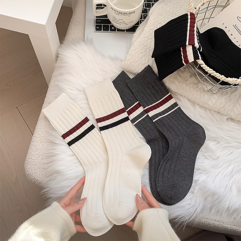 冬季袜子女士中筒袜韩系条纹长筒袜子保暖休闲袜百搭两杠堆堆袜