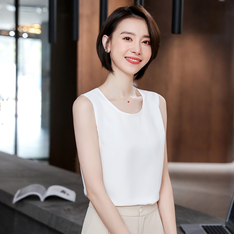 无袖衬衫女雪纺夏百搭打底上衣宽松外穿坎肩白色圆领内搭背心衬衣