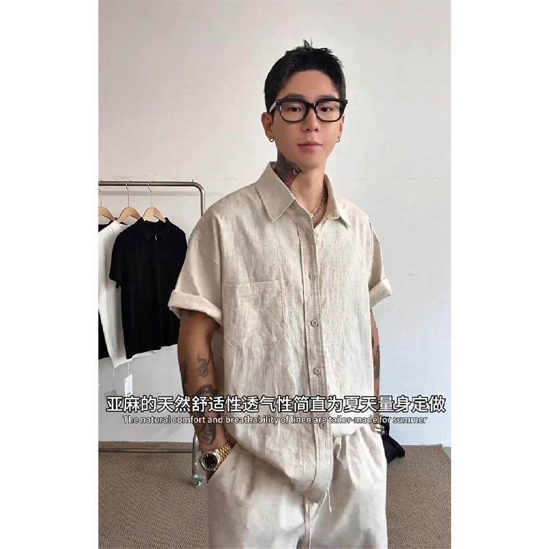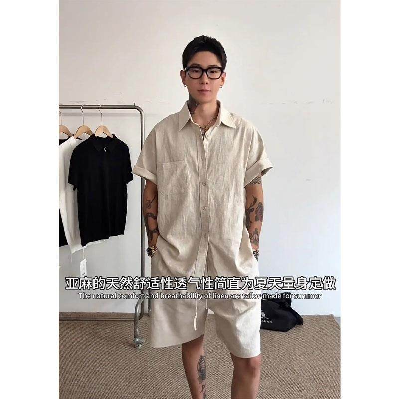 潮牌天丝亚麻套装男士2025年夏季新款松弛感穿搭男短袖短裤一整套