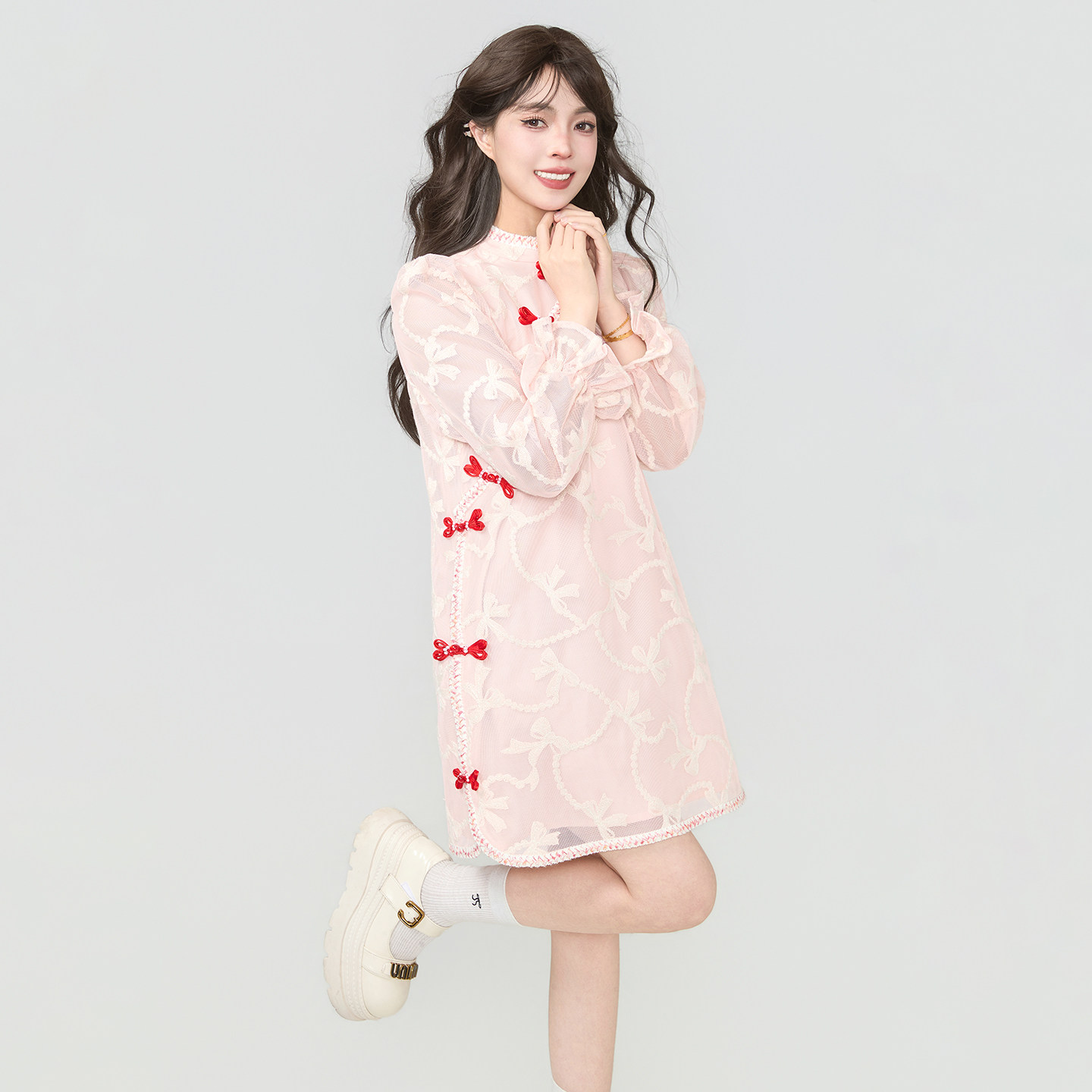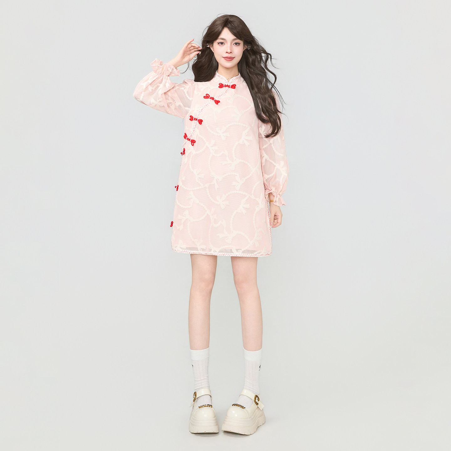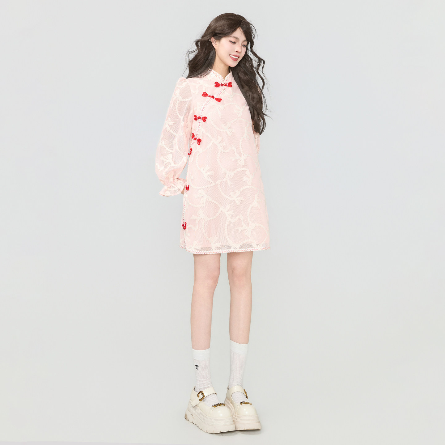 KEIKO 新中式勾花蕾丝改良旗袍连衣裙春夏国风盘扣饰泡泡袖A字裙