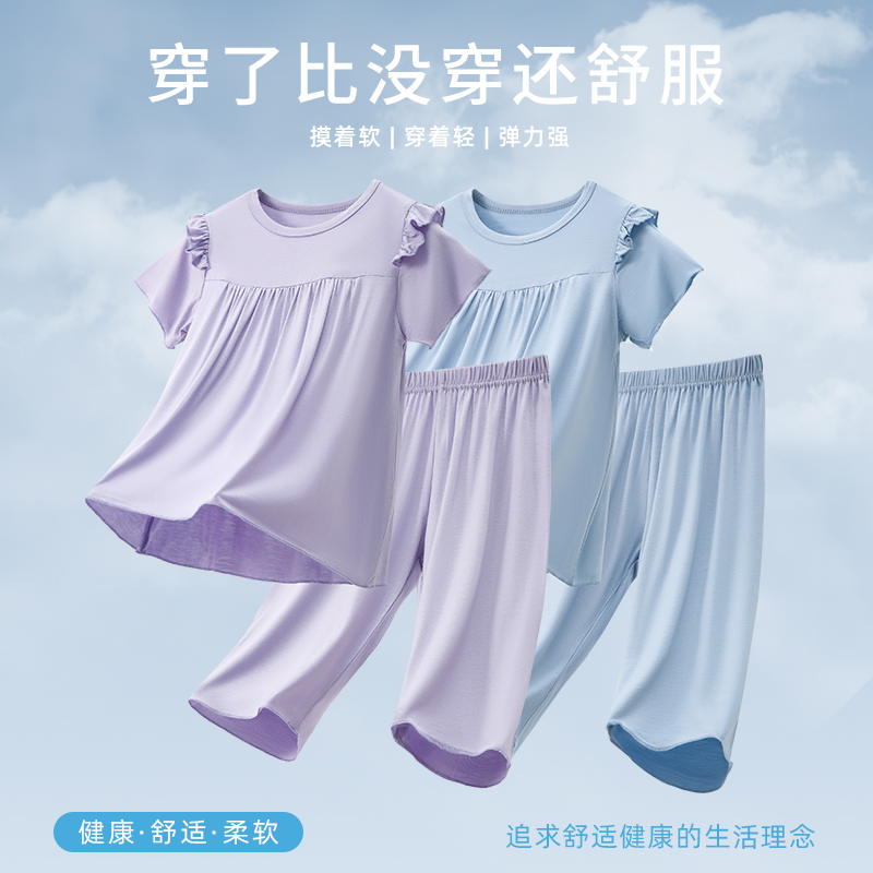 女童睡衣莫代尔薄款女孩空调服宝宝家居服飞飞袖冰丝短袖长裤套装