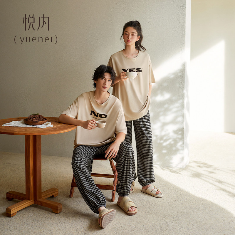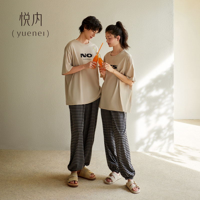 悦内情侣睡衣女夏季春夏纯棉短袖长裤家居服男款休闲宽松大码套装