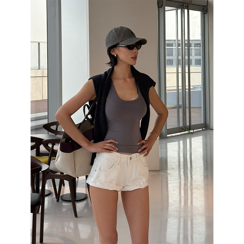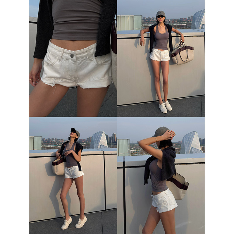 VanessaLab 夏季白色做旧卷边牛仔短裤女辣妹风明线留须休闲裤