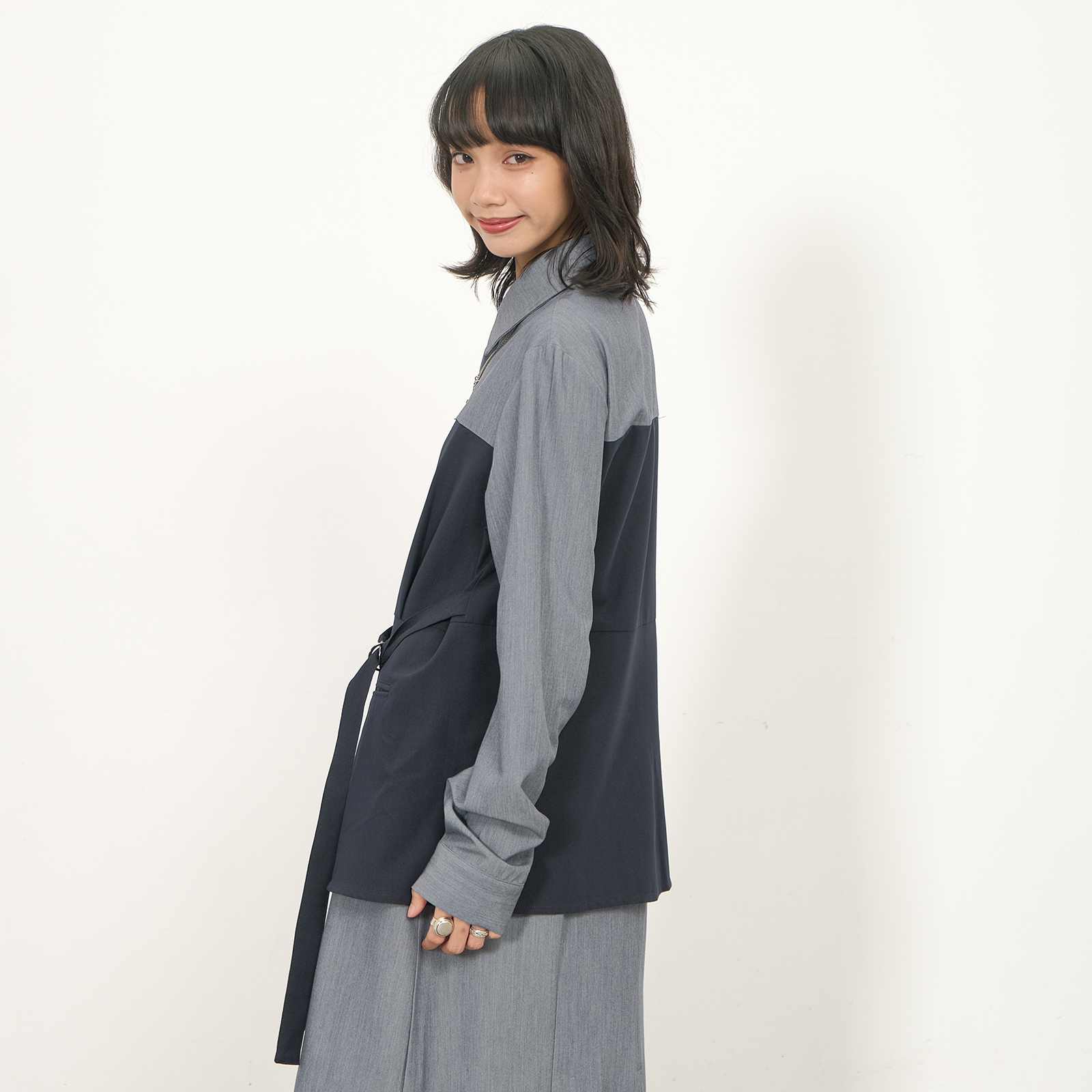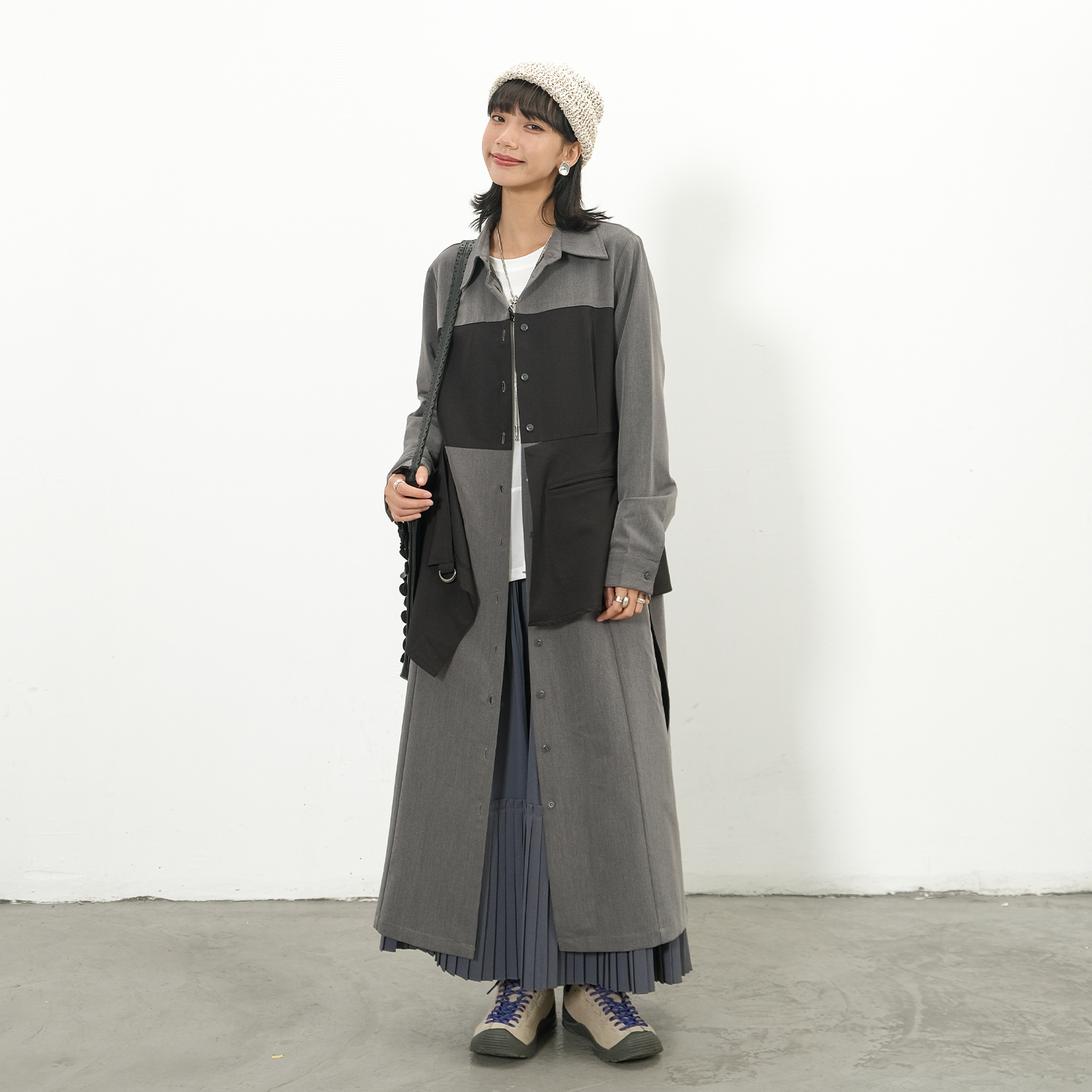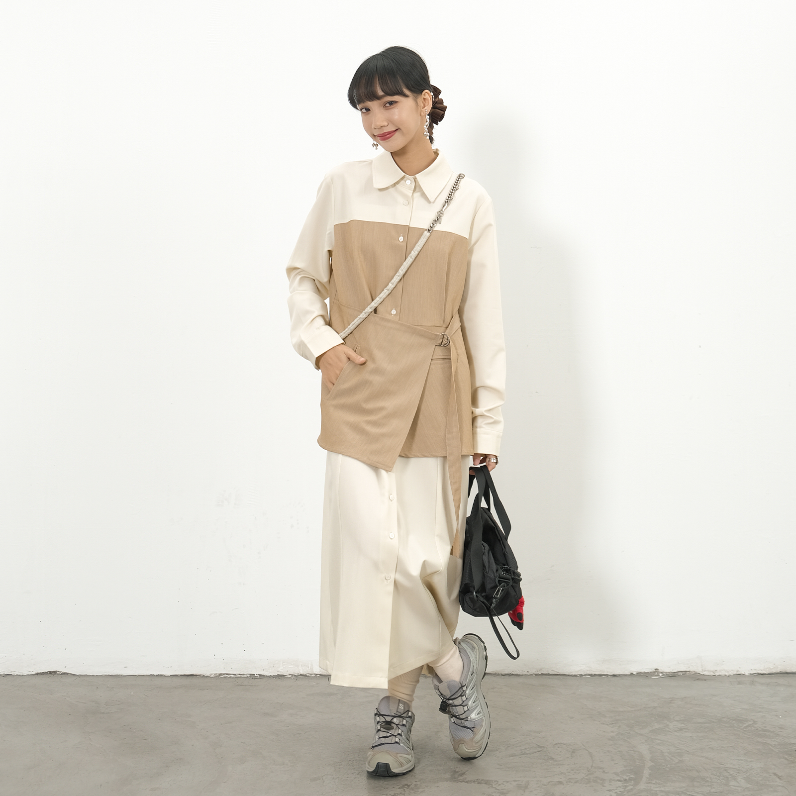 inkday日系轻复古假两件拼接衬衫裙女 单排扣可收腰气质连衣裙秋