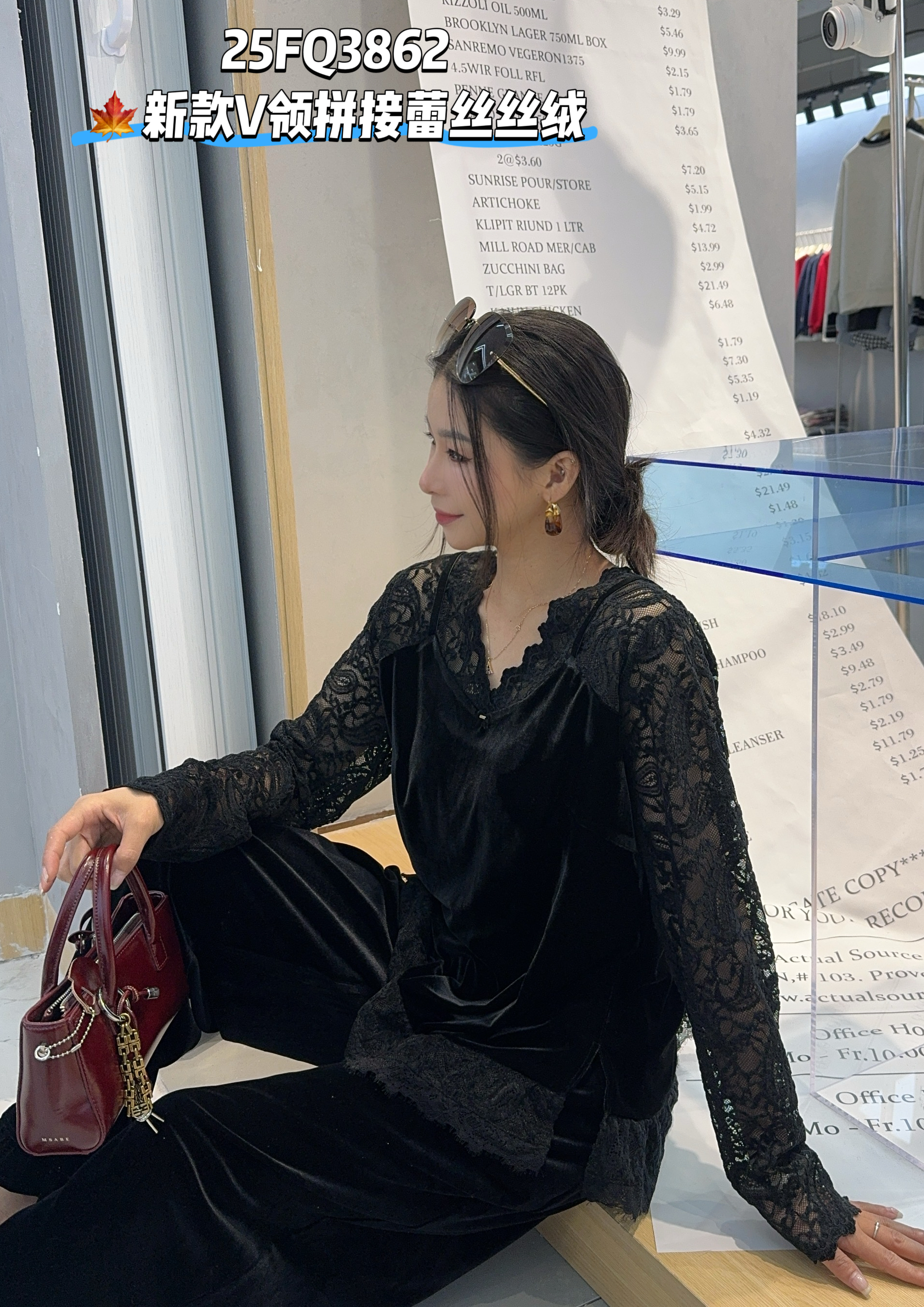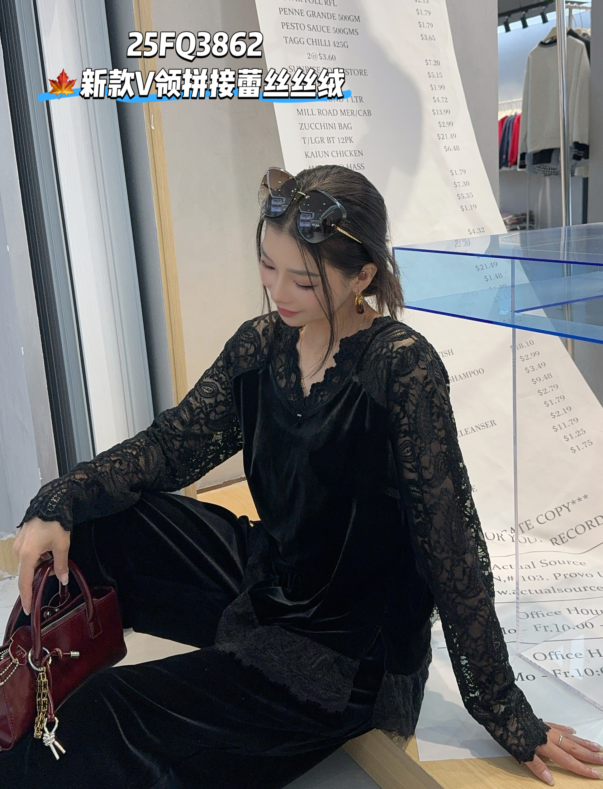 妃儿红3862秋加大码卫衣女 蕾丝拼接丝绒长袖V领打底衫