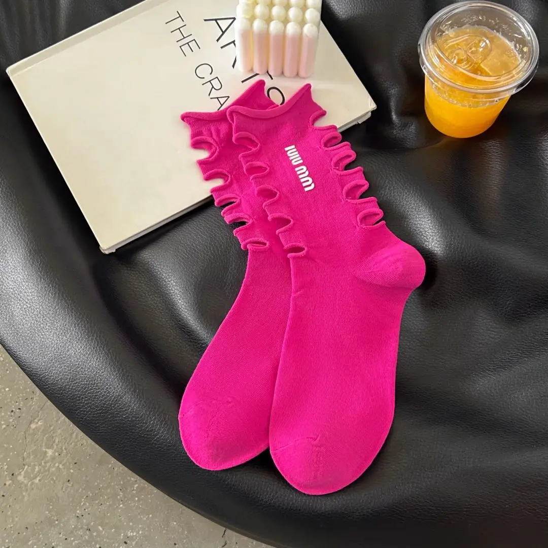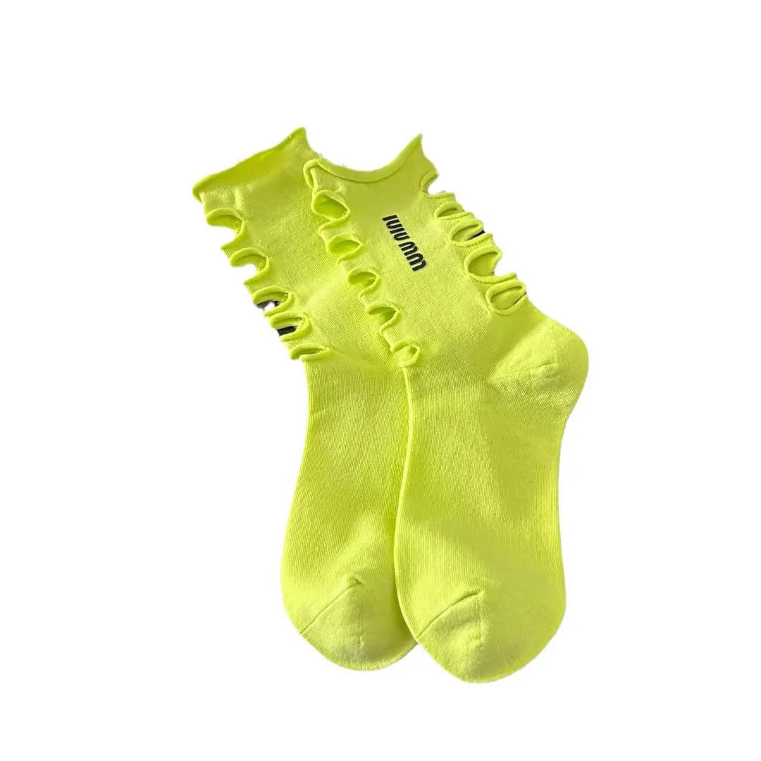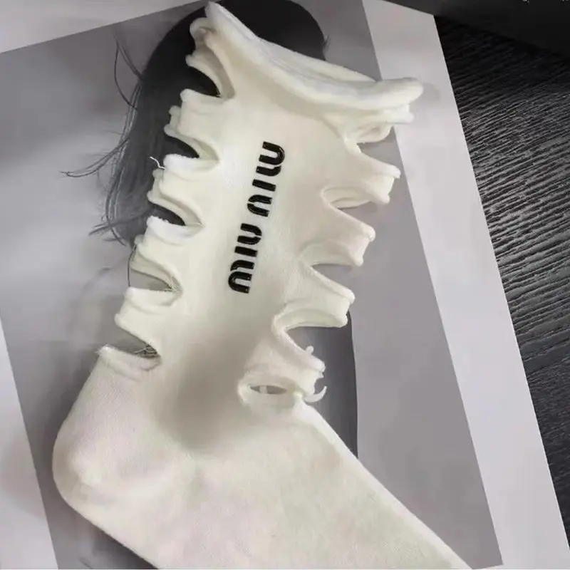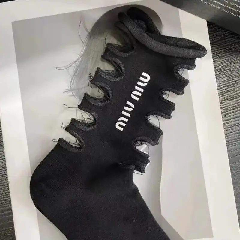 纯棉袜子女春夏薄款个性网红破洞鱼骨袜欧货烫印字母ins潮中筒袜