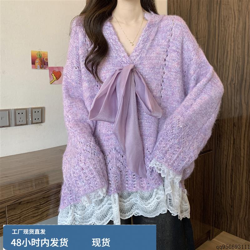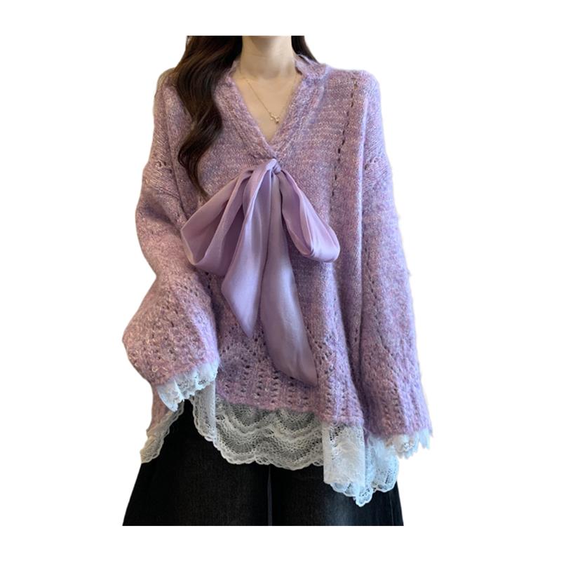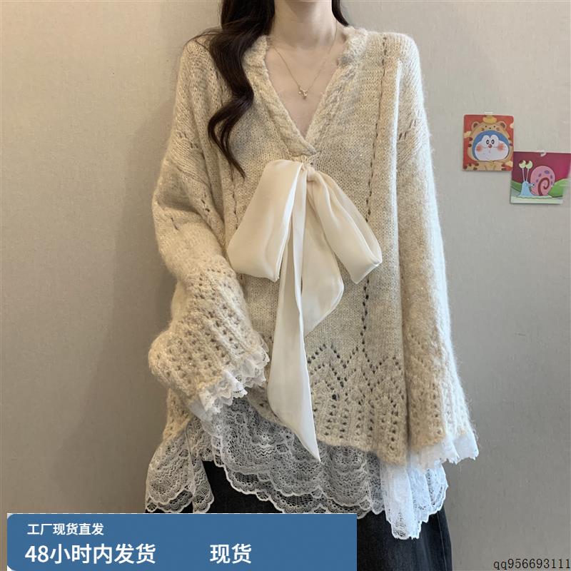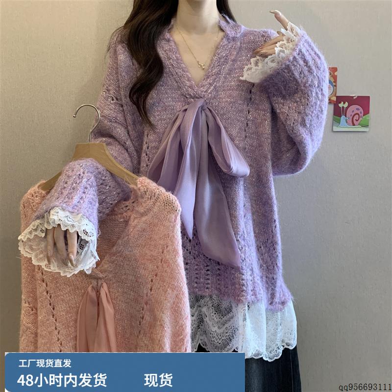 法式温柔蝴蝶结V领毛衣女秋冬大码胖mm宽松中长款遮屁股针织上衣