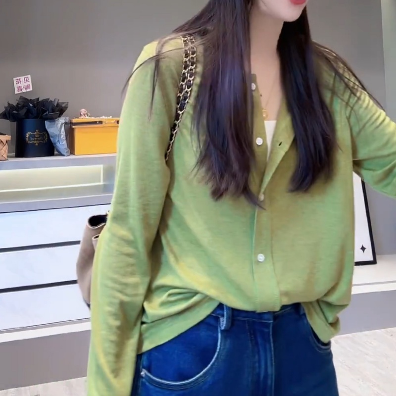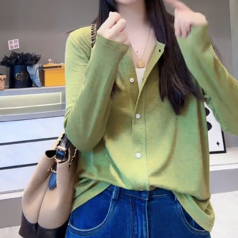 清绿色薄款长袖针织衫女2025年新款秋装毛衣开衫短款宽松上衣外套