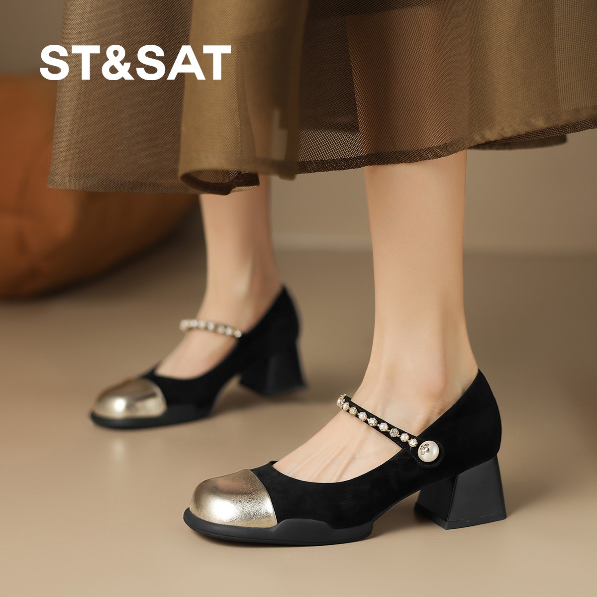 St&Sat/星期六法式玛丽珍女鞋2025新款粗跟珍珠皮鞋浅口平底单鞋
