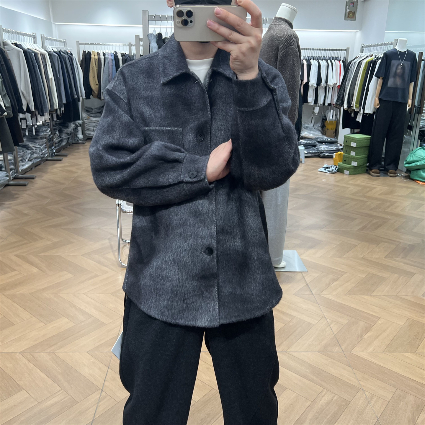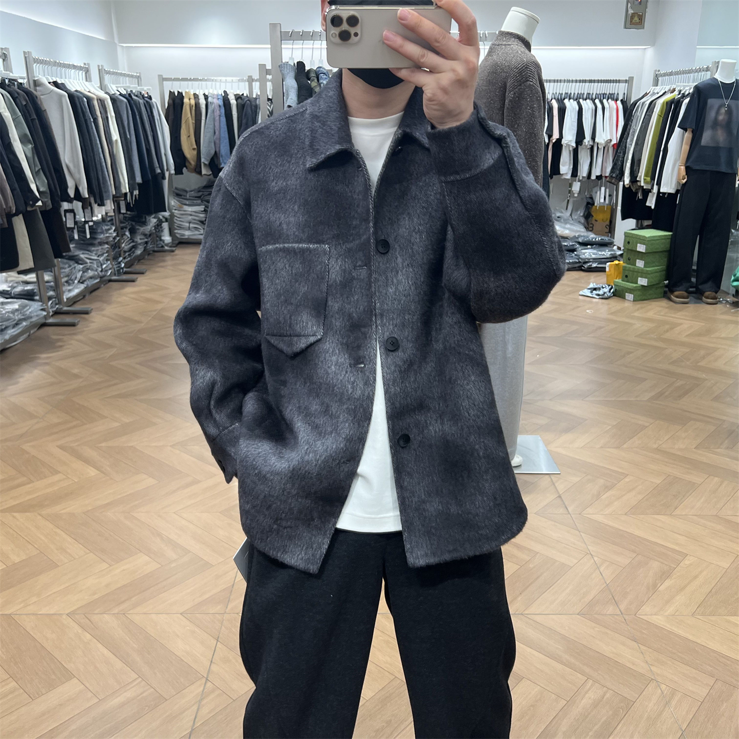 轻奢复古扎染渐变色双面羊毛呢大衣男秋冬美式宽松保暖衬衫款外套