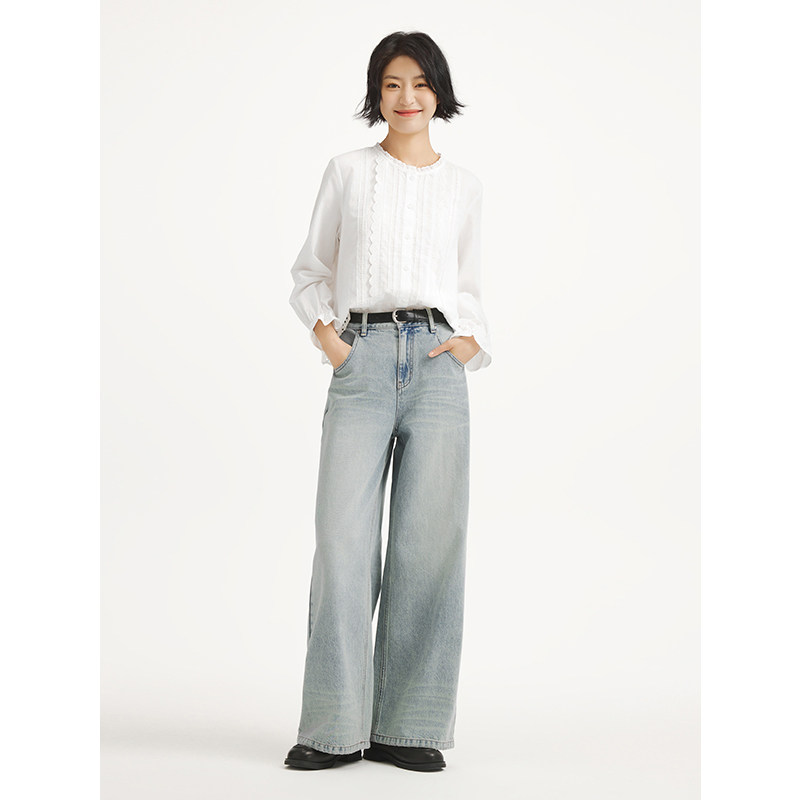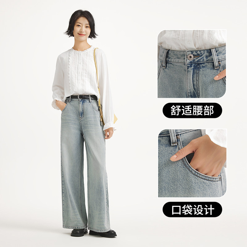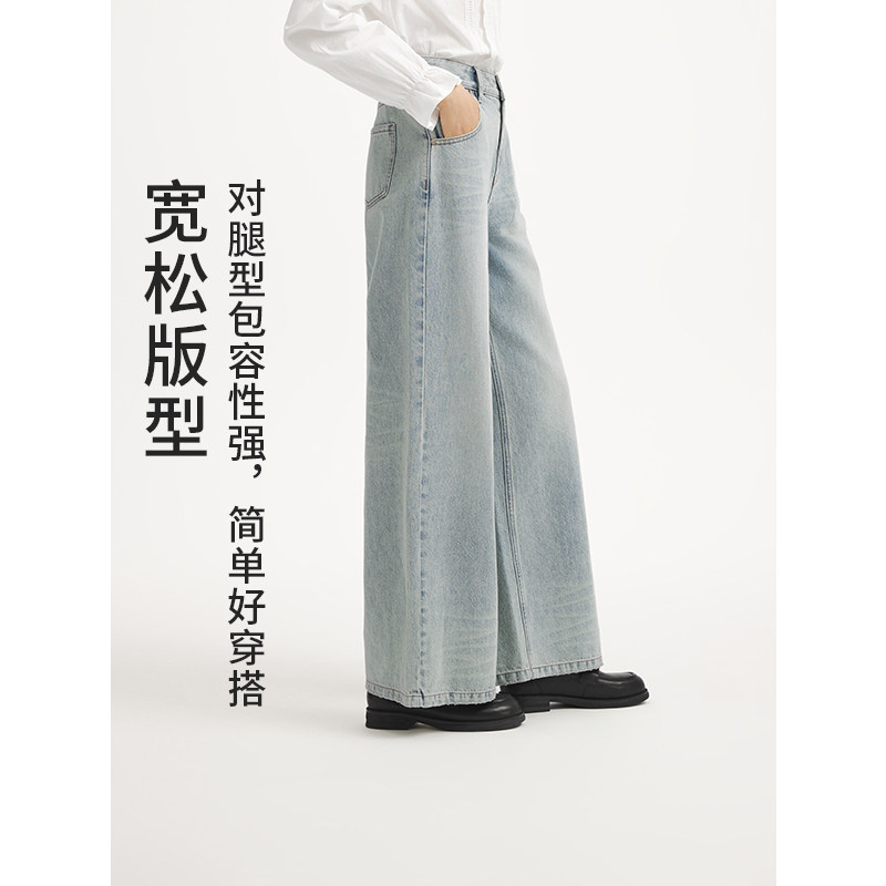 热风女士牛仔裤2025年秋季新款时尚阔腿宽松显瘦浅色高腰直筒长裤