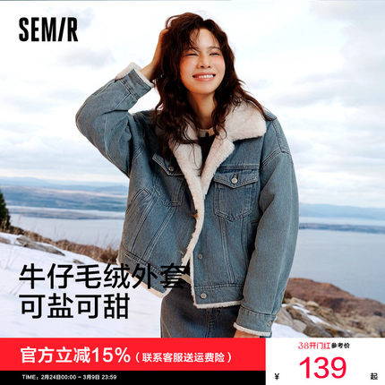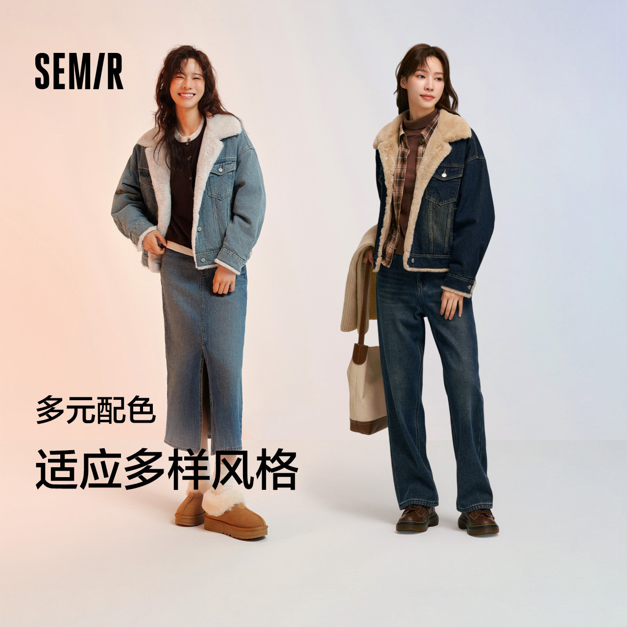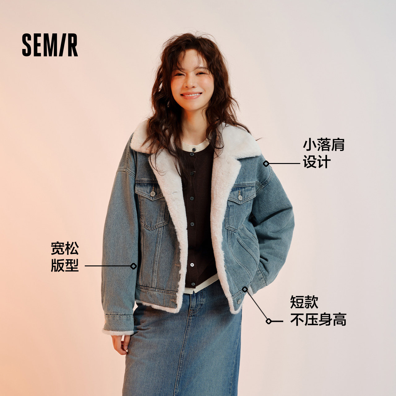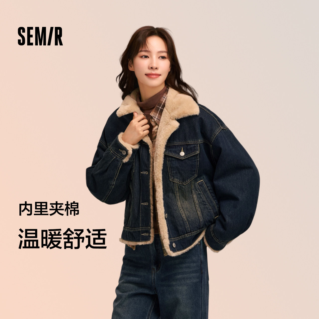 [商场同款]森马牛仔外套女拼接仿兔毛翻领宽松2025新款冬夹棉夹克