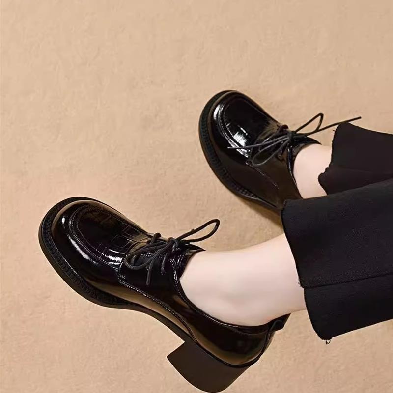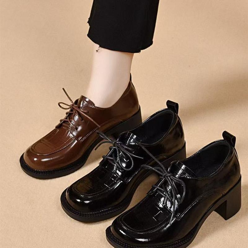 真皮圆头粗跟深口单鞋女2025年春季新款中跟软底系带百搭小皮鞋女