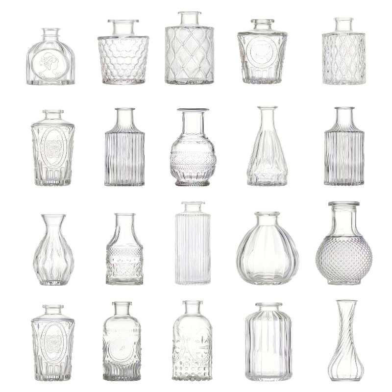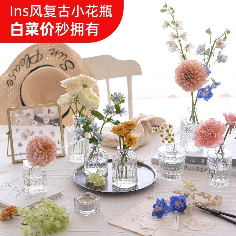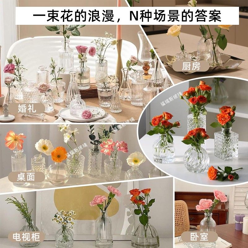 迷你小花瓶玻璃透明法式浮雕桌面插花复古轻奢鲜花车载高级感摆件