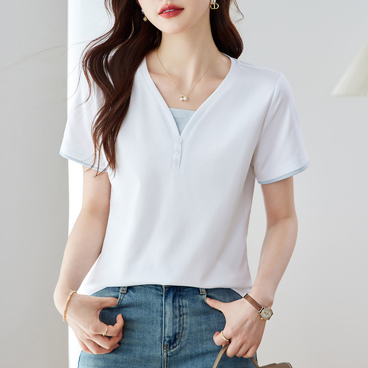 v领正肩短袖t恤女2025新款夏季爆款洋气女装宽松半袖上衣高端体恤