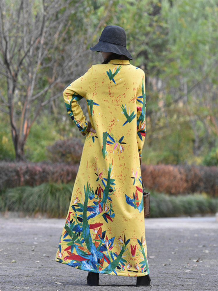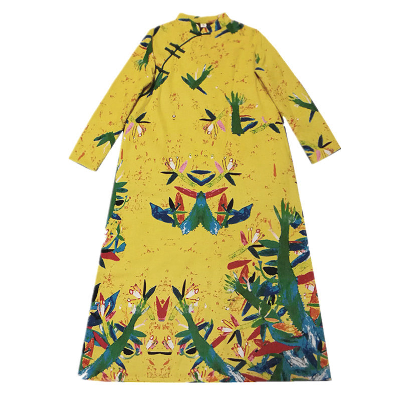 【奴娇】素心自制民族风连衣裙长款秋冬加绒加厚棉麻印花长裙特价