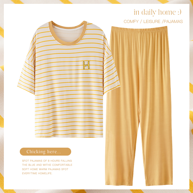 睡衣女士夏季短袖长裤莫代尔薄款夏天大码宽松中年妈妈凉感家居服