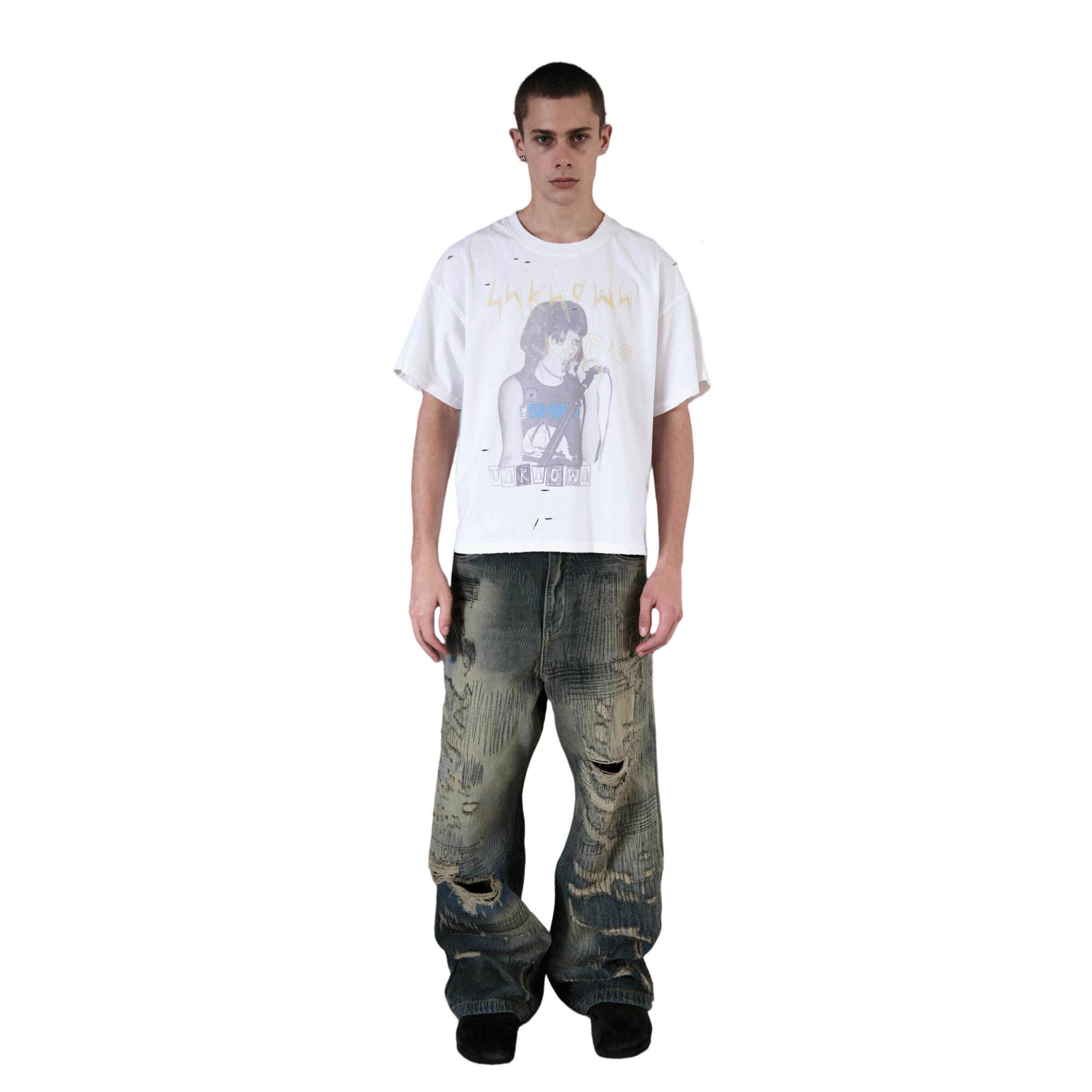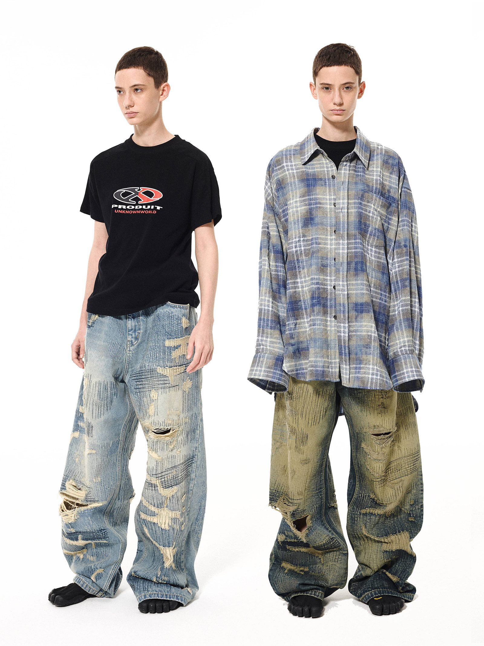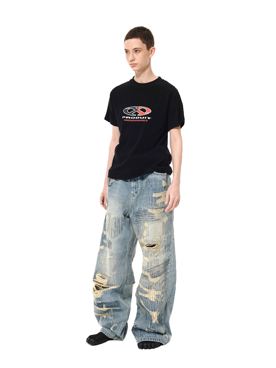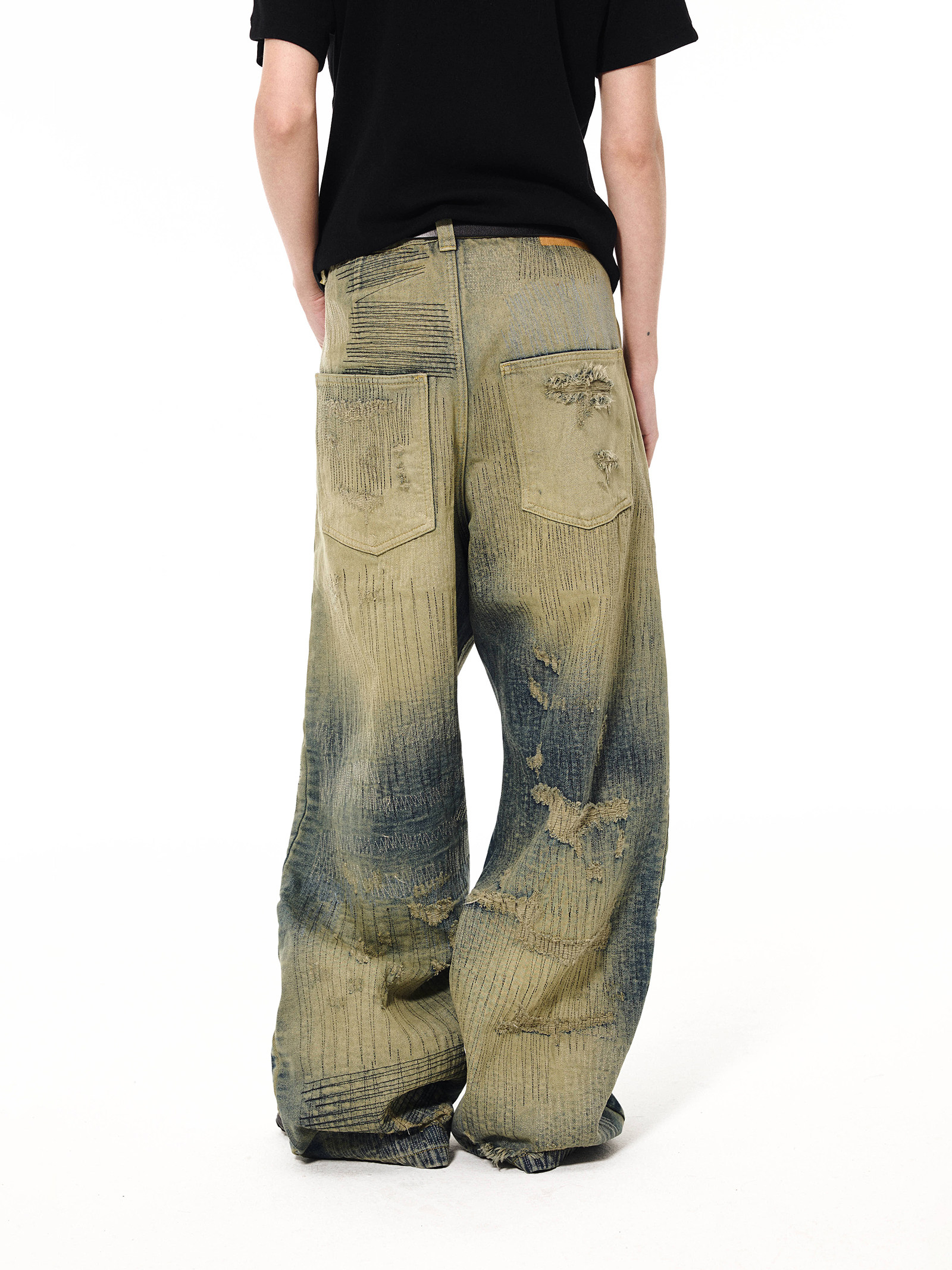 11PRODUITS重磅大破坏乱针刺绣中性阔腿泥染/冰蓝水洗牛仔裤