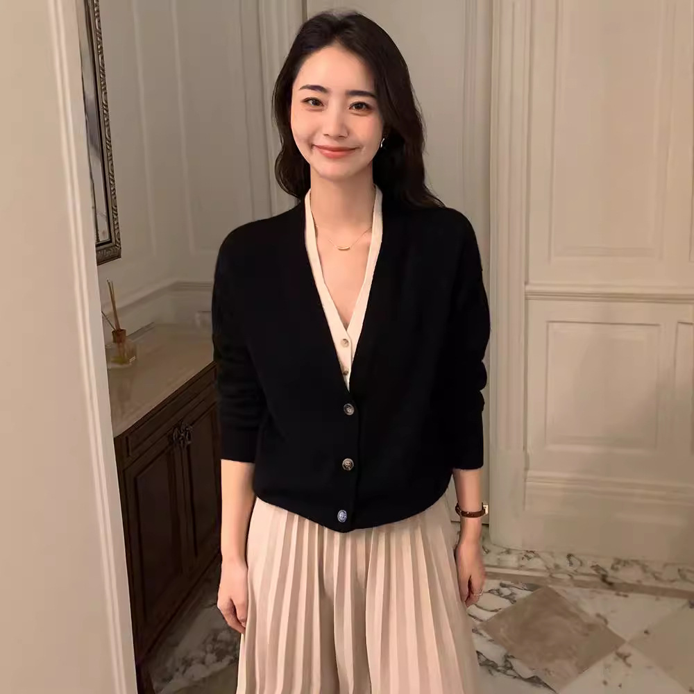 V领羊绒开衫女2025秋冬新款系扣假两件针织长袖毛衣宽松羊毛外套
