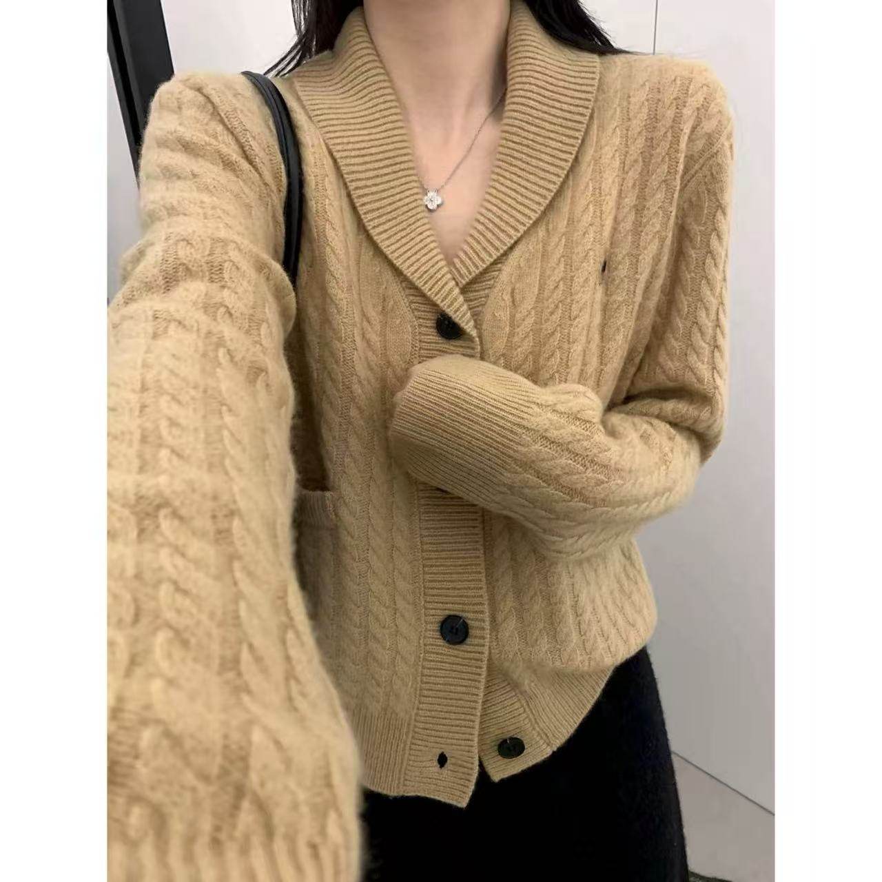 【射手座】绞花针织开衫 小马刺绣围脖翻领麻花毛衣2592
