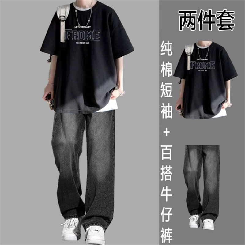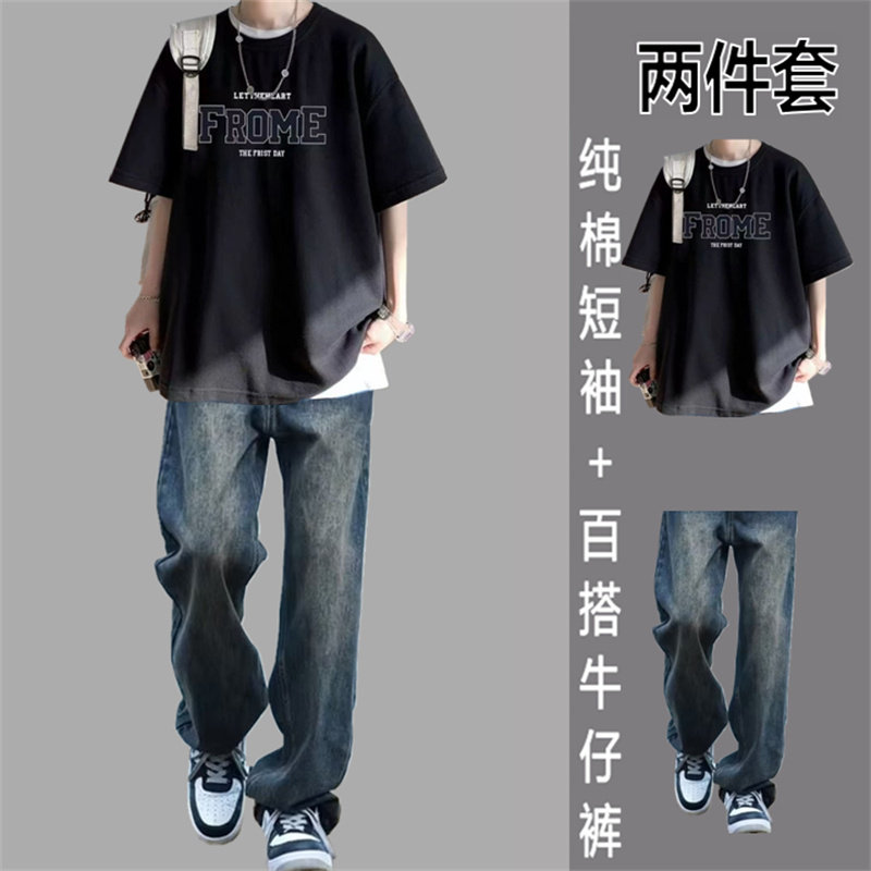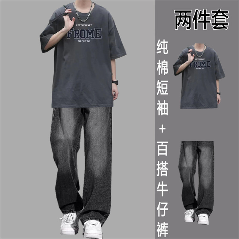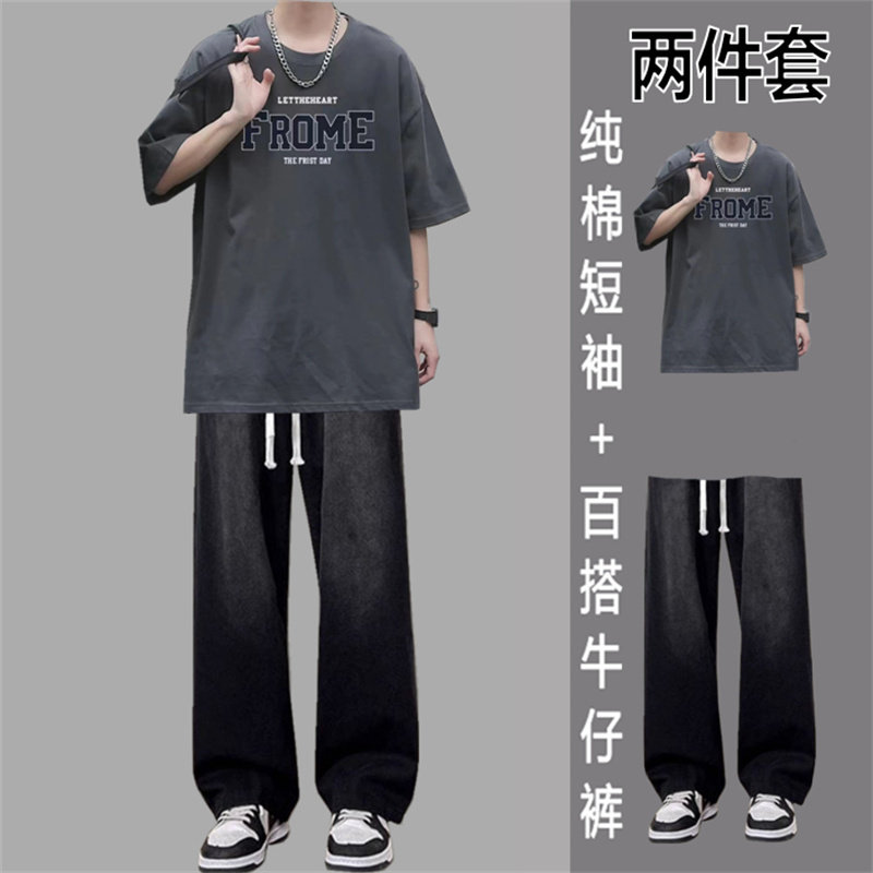男夏季休闲运动套装男士牛仔裤男生韩版薄款休闲纯棉短袖T恤ins